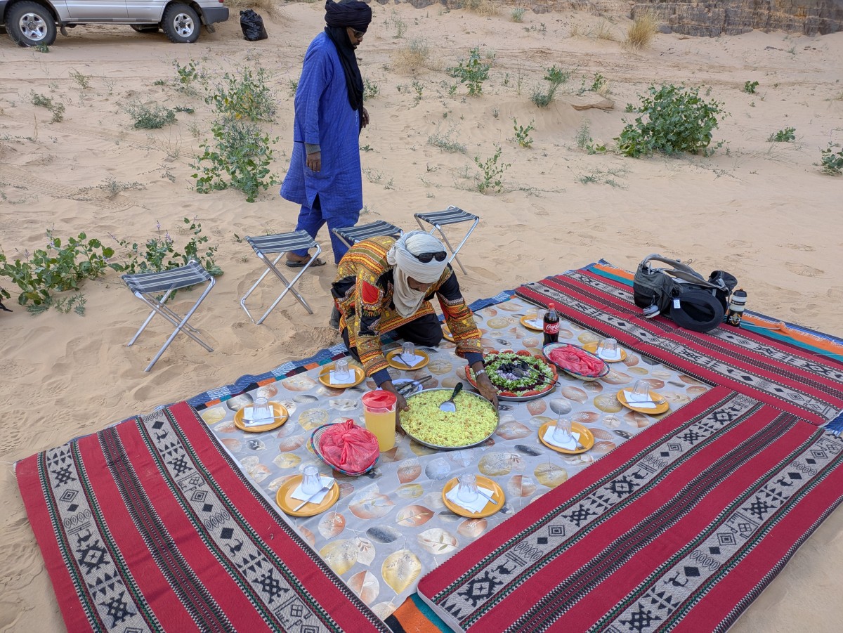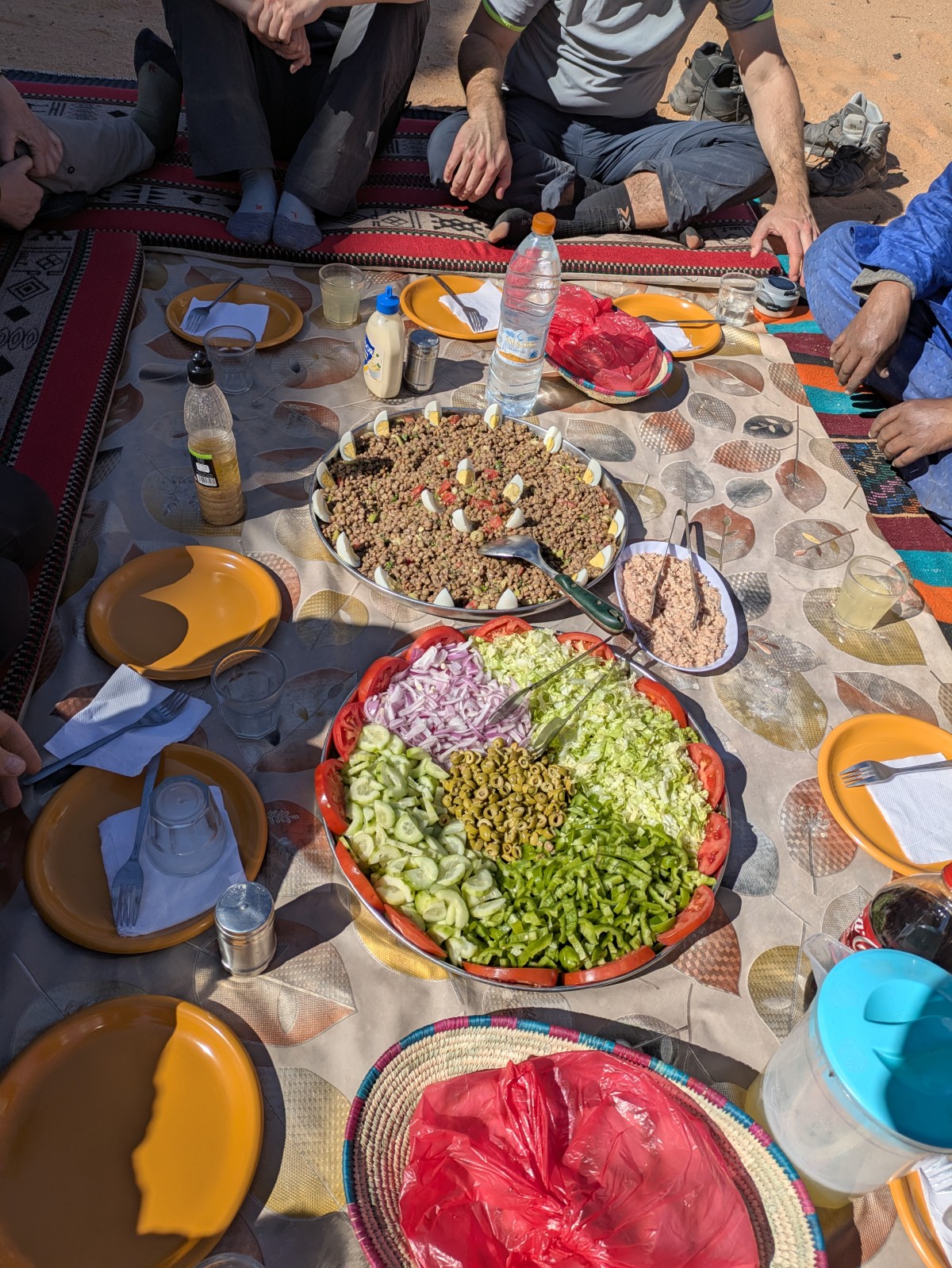 Am Mittagsplatz angekommen werden wir gebührend versorgt. Neben dem riesigen Salatteller gibt es meist ein Gericht aus