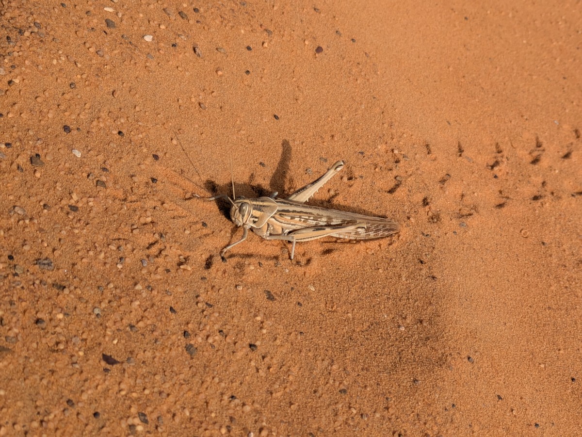 Eine große Heuschrecke hinterläßt ihre Spuren im Sand.