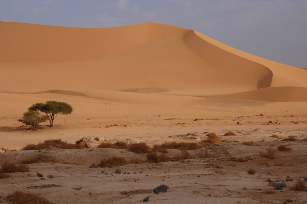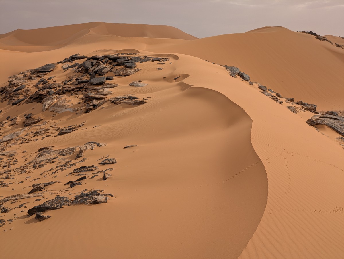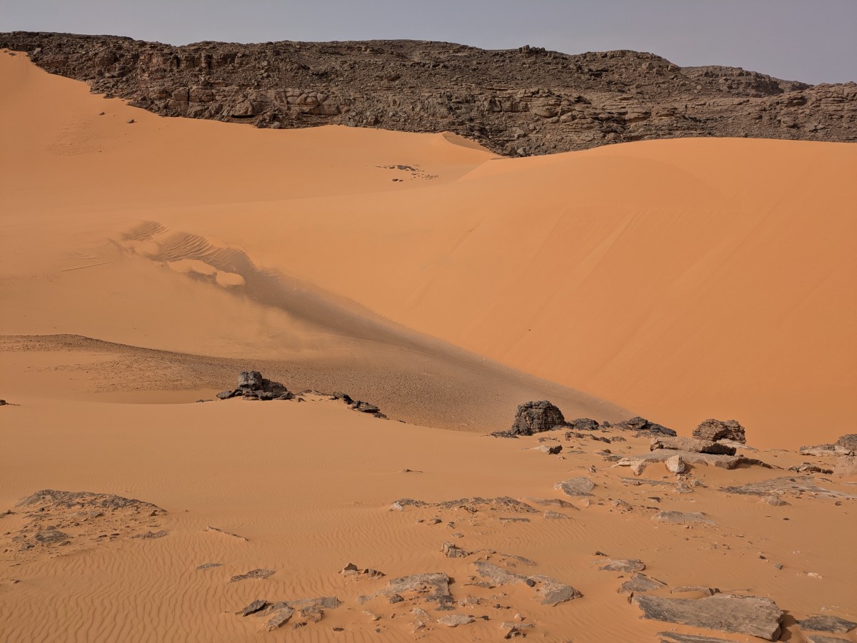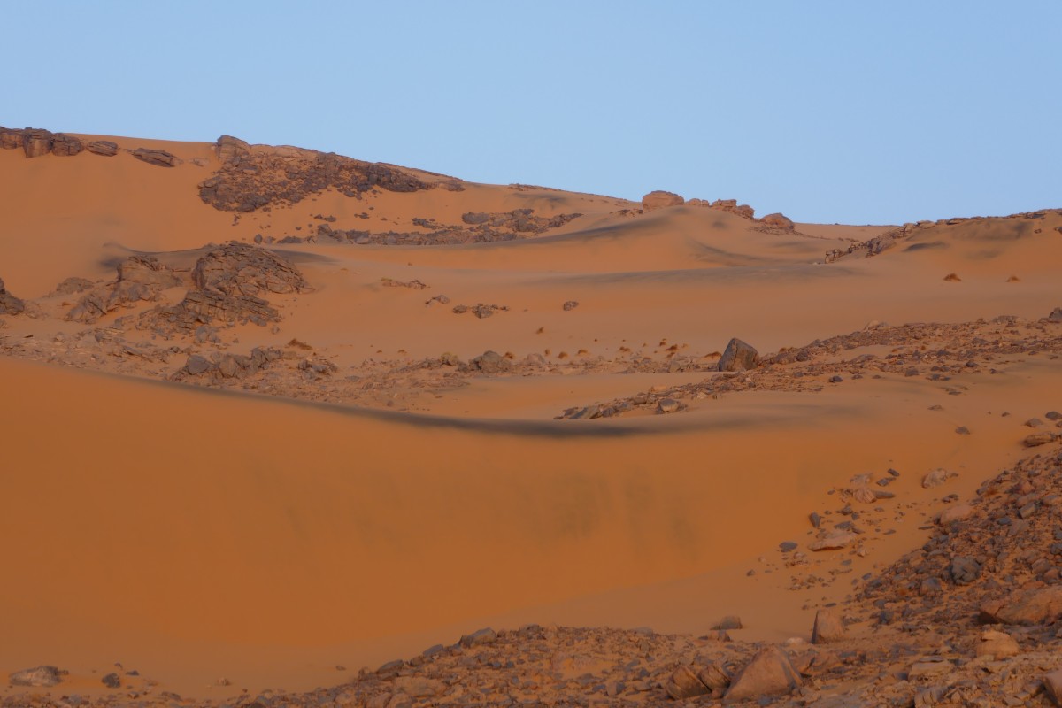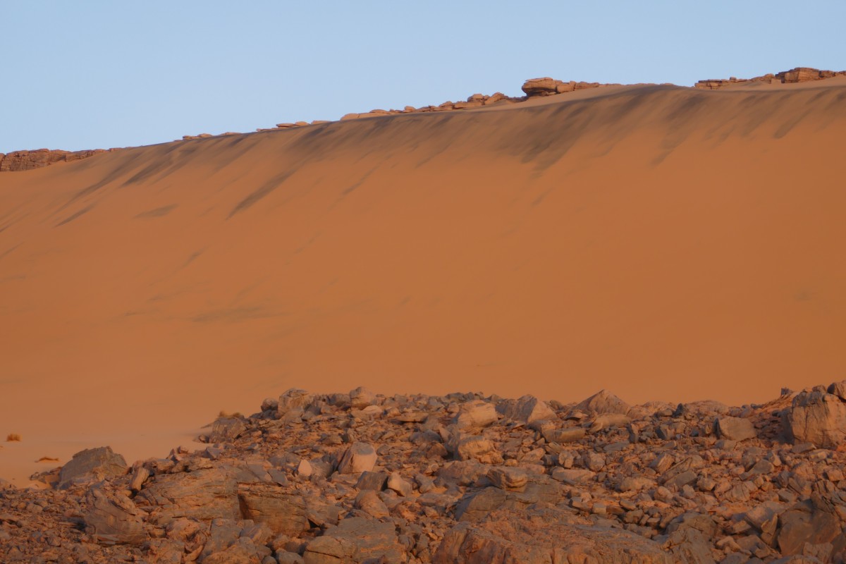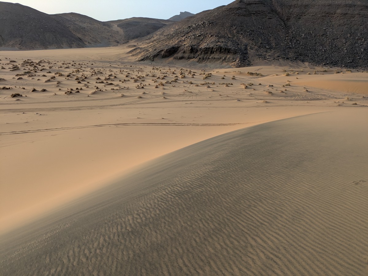 Unser Abendlager - das letzte in der Wüste - beziehen wir bei den Dunes Noires, den schwarzen Dünen. Graphithaltiger Sand mit