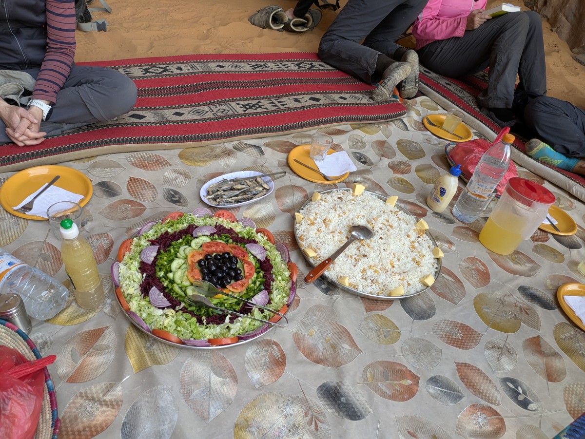 und haben ein letztes gemeinsames Abendessen auf den vertraut gewordenen Sitzmatten. Nach dem obligatorischen Wüsten-Tee verabschieden