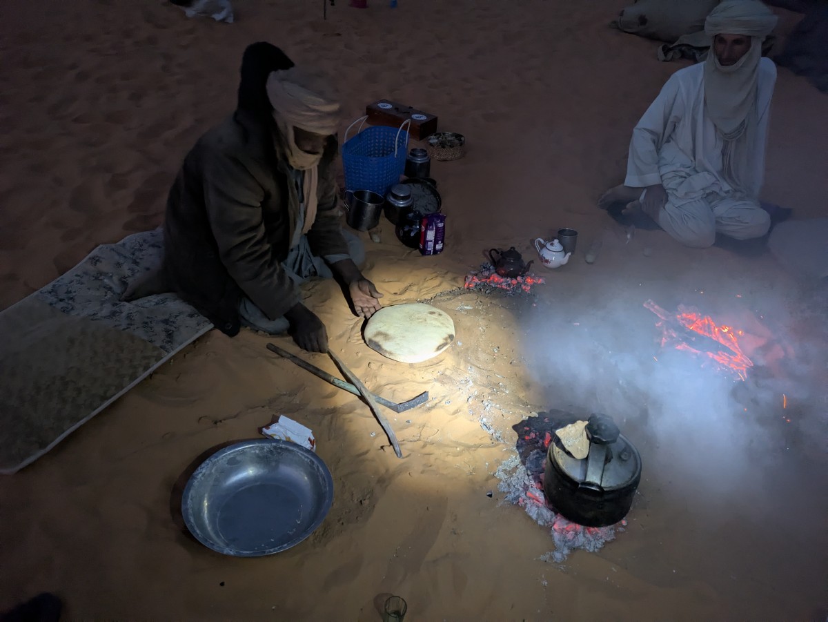 Abends haben wir die Gelegenheit, die Backkünste der Touareg zu bewundern. Das Brot wird im Sand über der Glut gebacken und