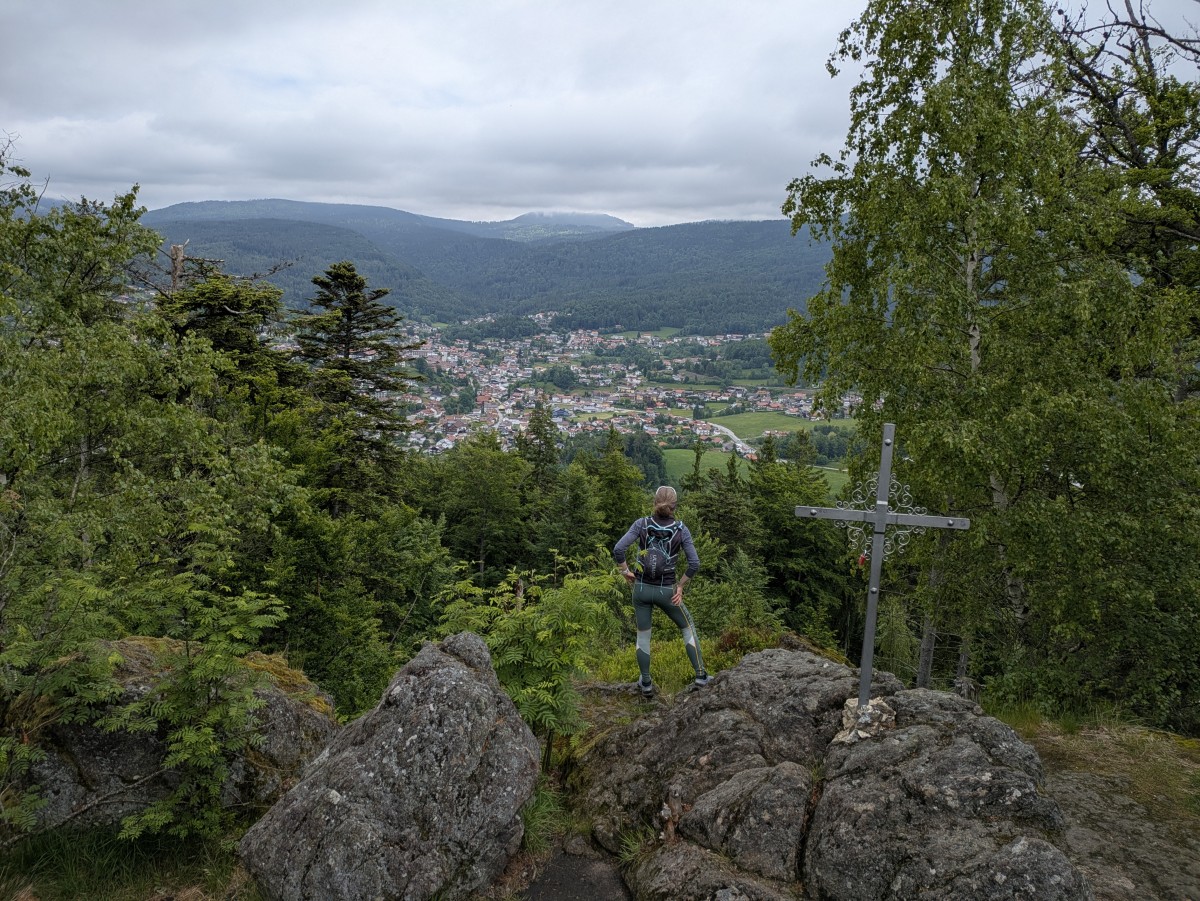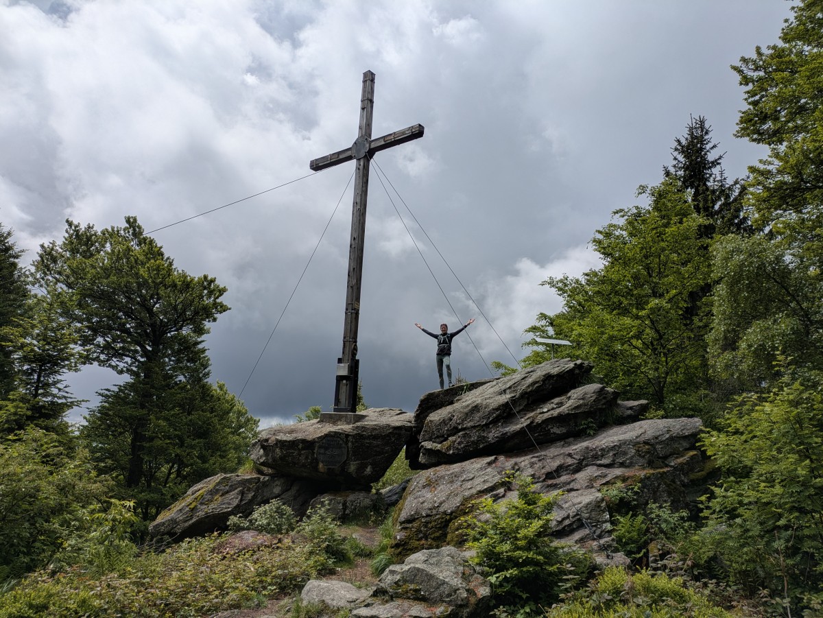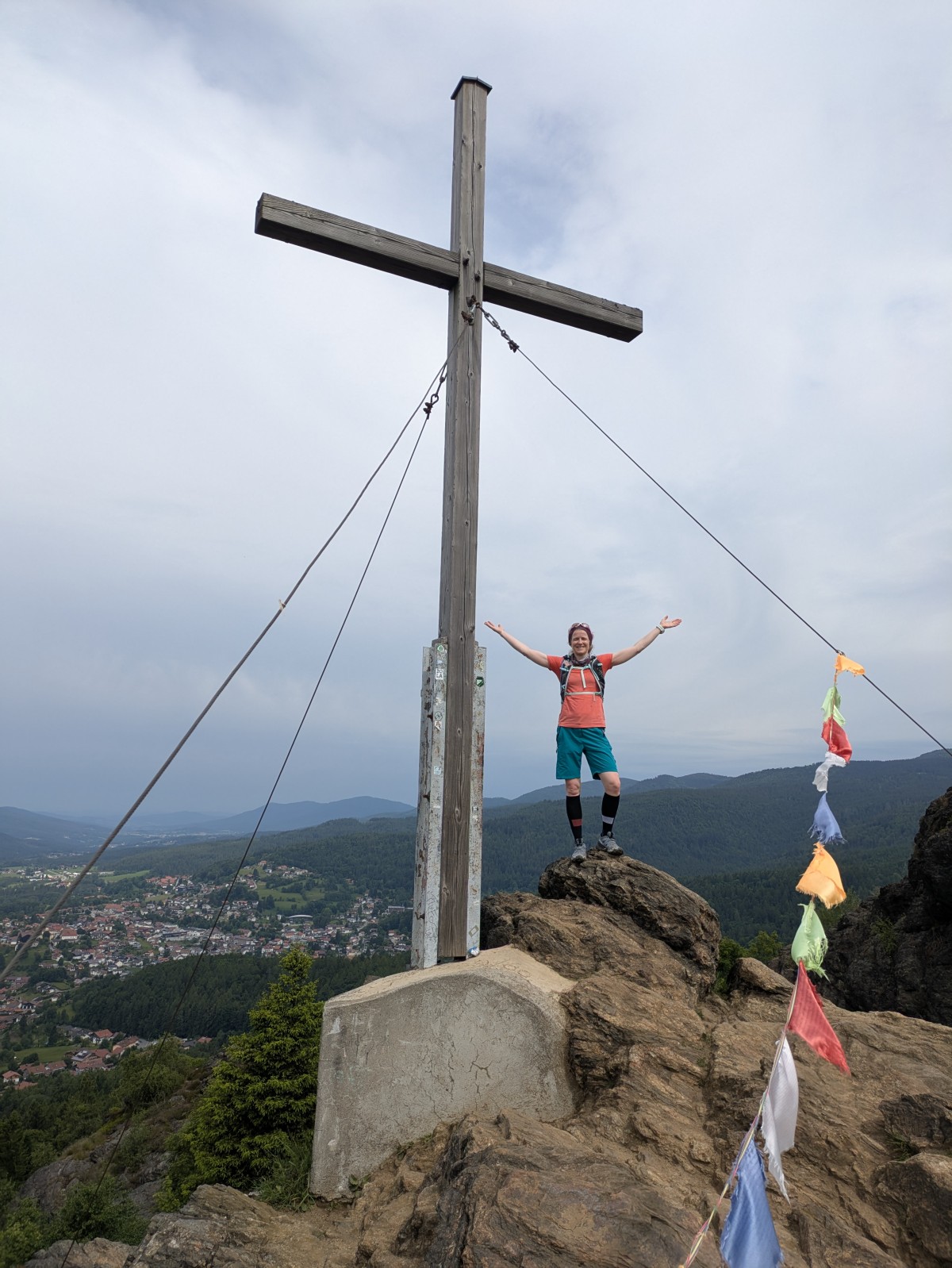 Nach dem waldigen Gipfel laufen wir zum Steckenbergkreuz hinab und von dort weiter in die Schleifmühlenklamm.