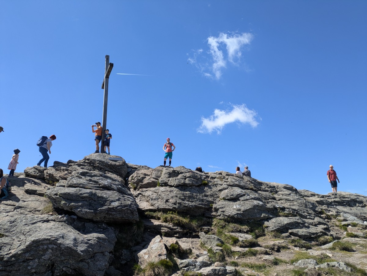 Schließlich erreichen wir die Gipfelwiese des Rosengarten, auf der eine steife Brise herrscht. Wir halten daher auch nicht an, sondern laufen