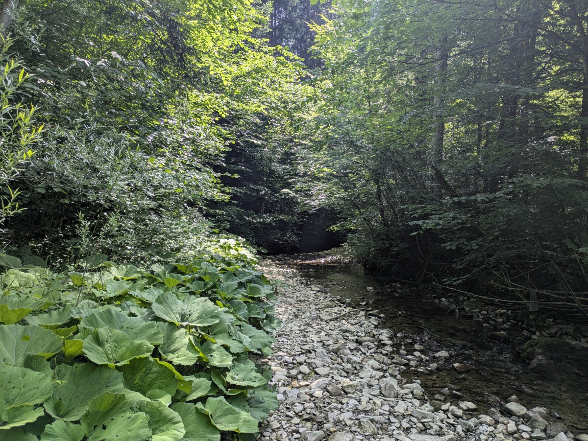 Es ist ein wirklich schwülheißer Tag, und ich bin froh, daß wir große Teile des Weges im Wald und an Bächen laufen - insbesondere auch,