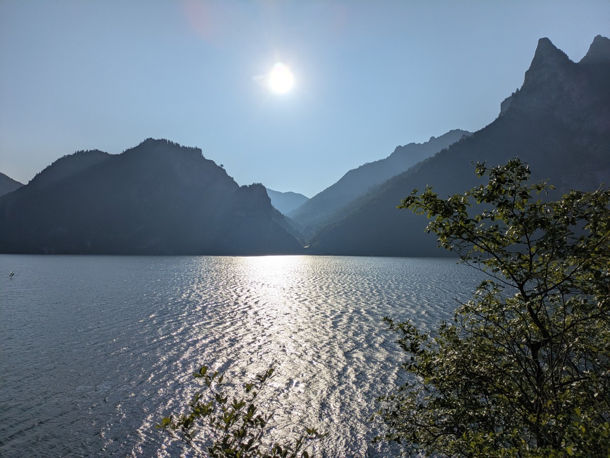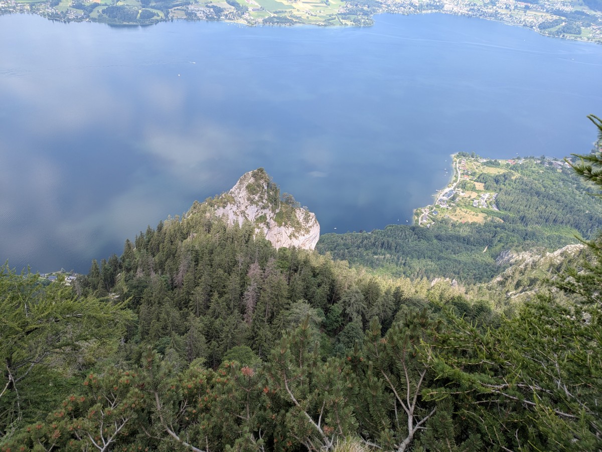 Der Traunsee erstreckt sich unter uns im Morgendunst.