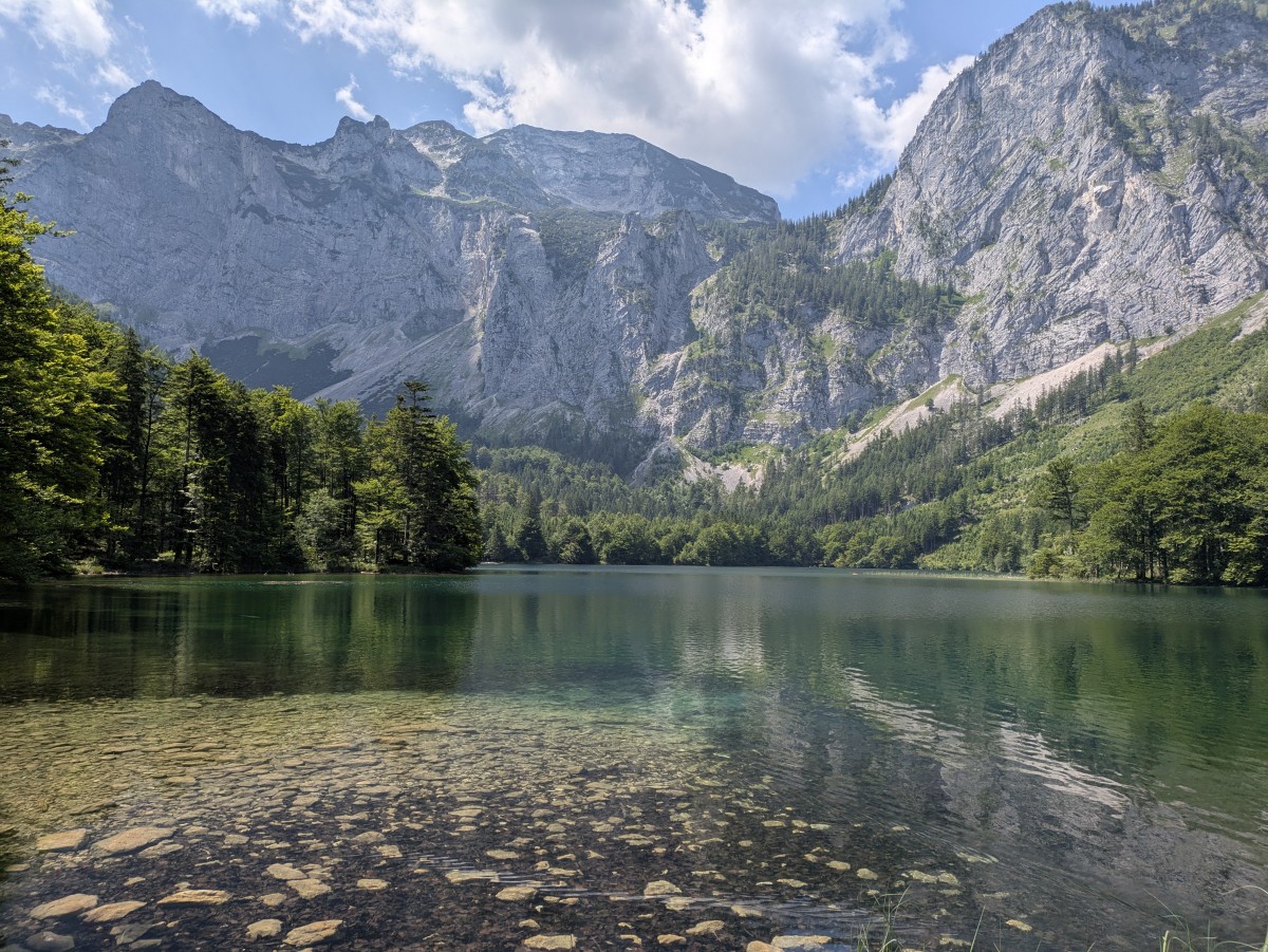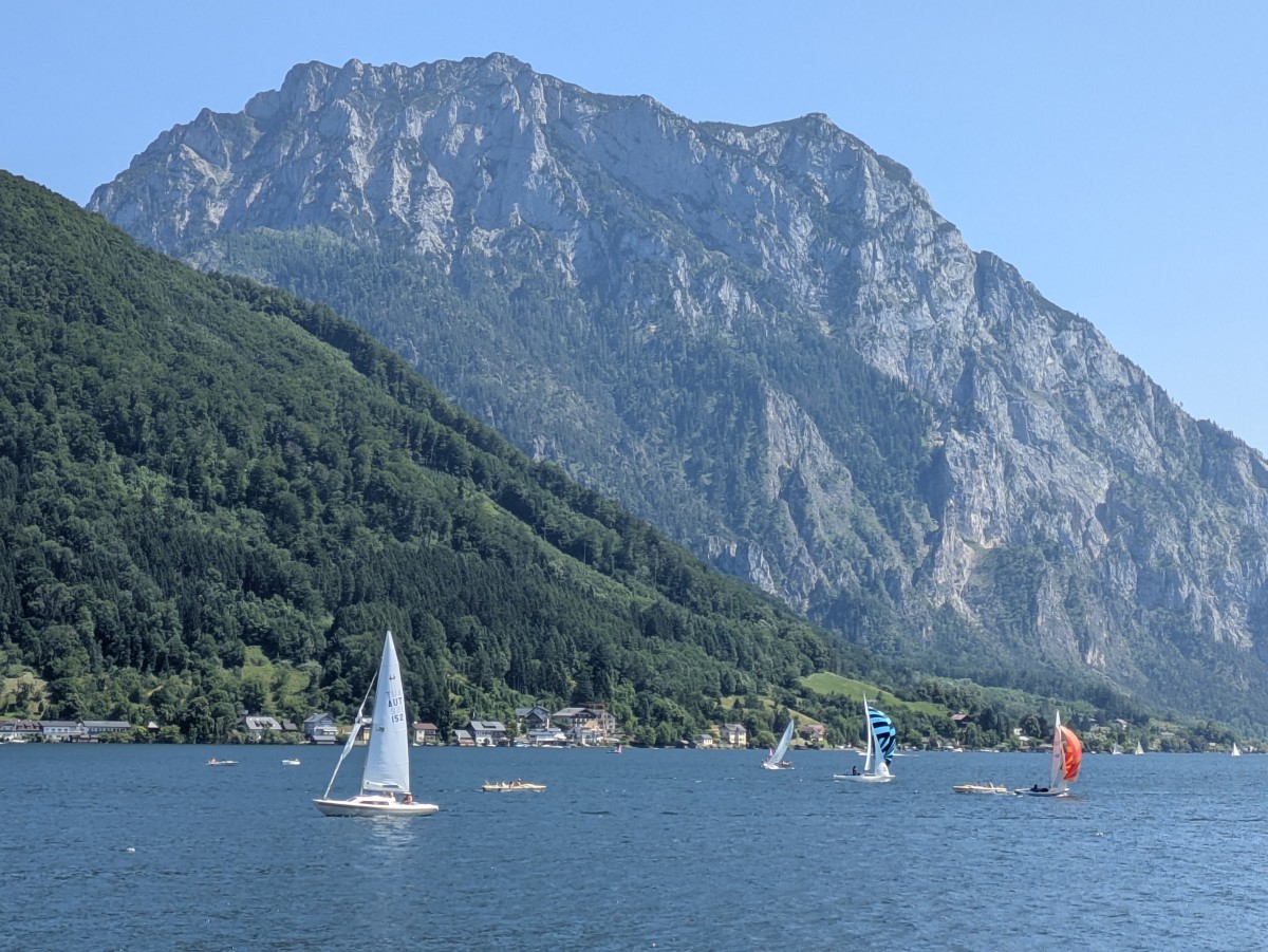 Im Hintergrund ragt der namensgebende Traunstein über dem See auf; wir werden den stolzen Felskopf in zwei Tagen besteigen.
