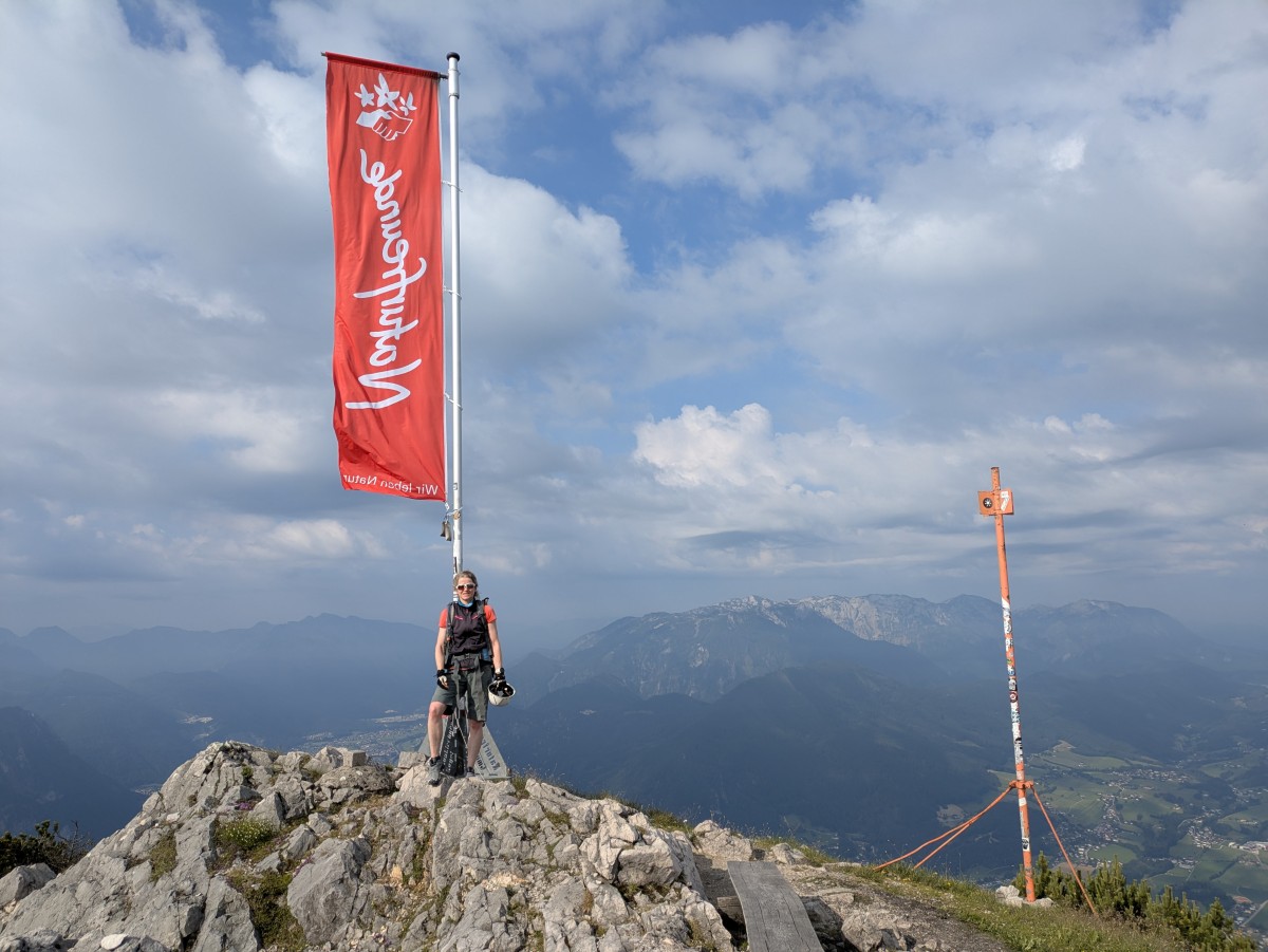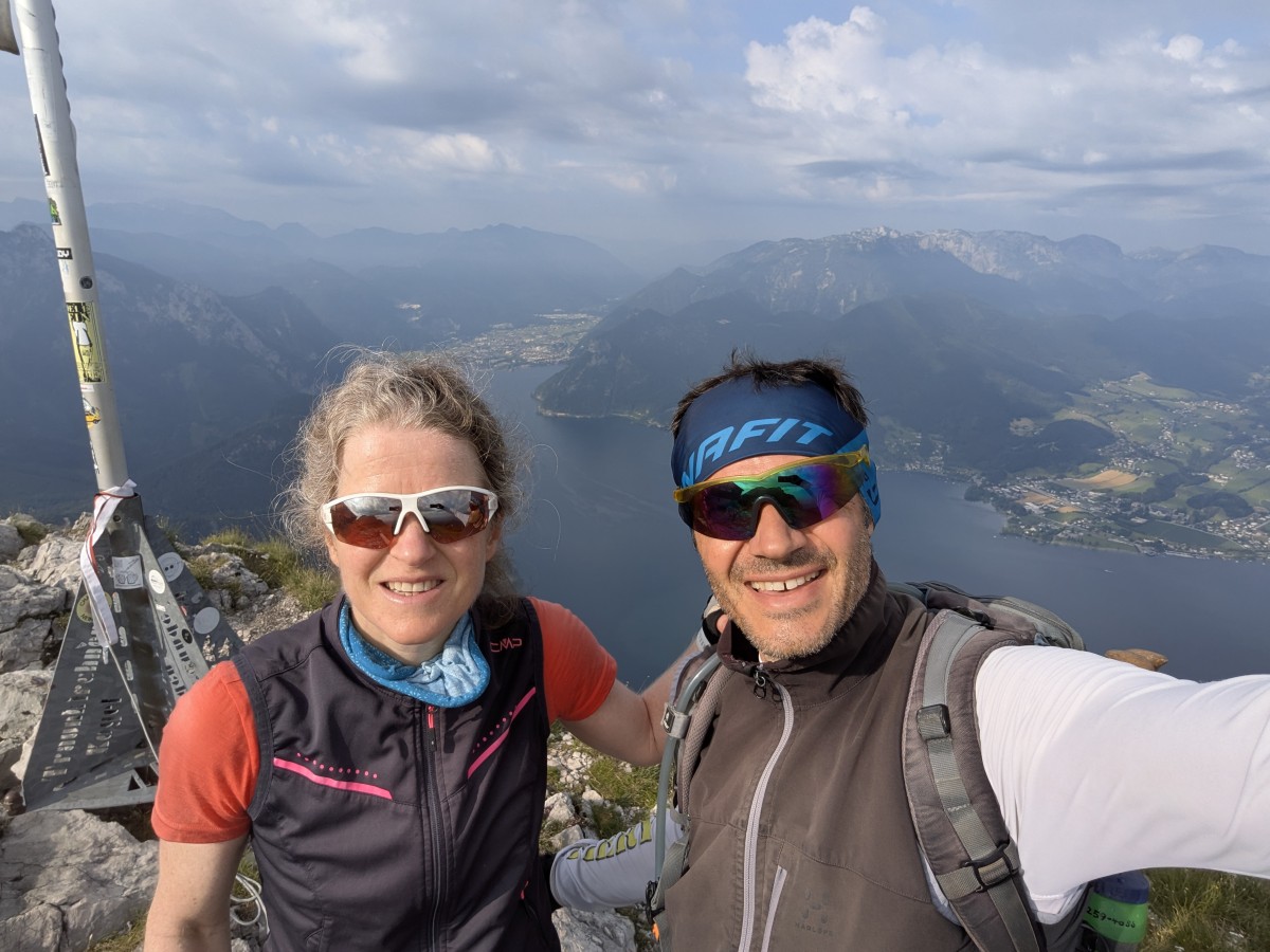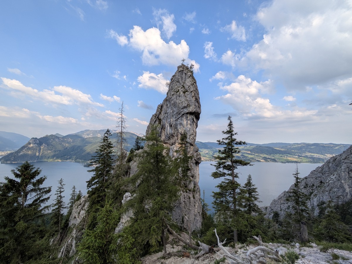 Nach einem wirklich schönen Anstieg stehen wir zwei Stunden später an dem ersten Vorgipfel des Traunsteins beim Naturfreundehaus.