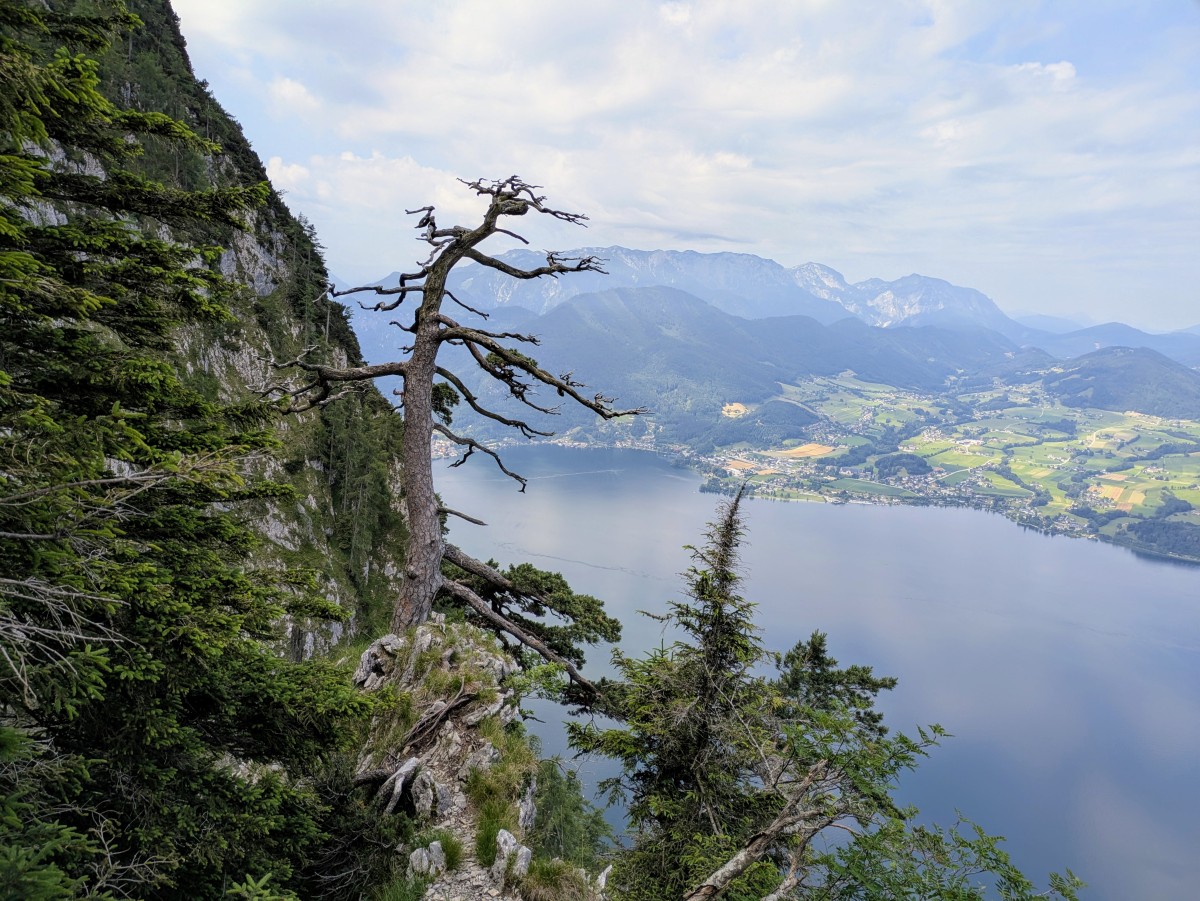 und wandern dann direkt am Ufer zum netten Miesweg, einem seilversicherten Steig direkt über dem Ostufer des Traunsees. Um halb sieben steigen