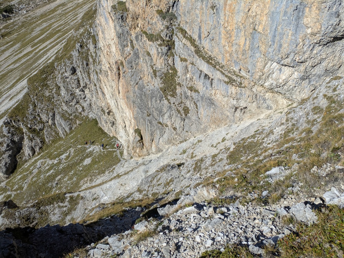wieder bergab. Den linken, etwas größeren Felskopf überwinden wir ziemlich direkt über zwei seilversicherte Stellen, während