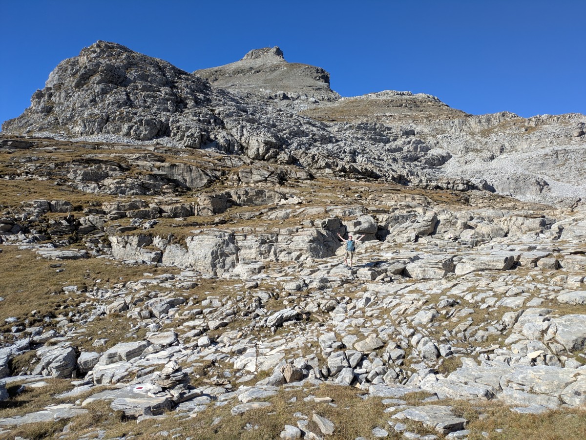 Aus dem Tal aus nicht einzusehen öffnet sich etwas unter dem Gipfel mit einem Mal eine weitläufige Karstebene - durchaus überraschend.