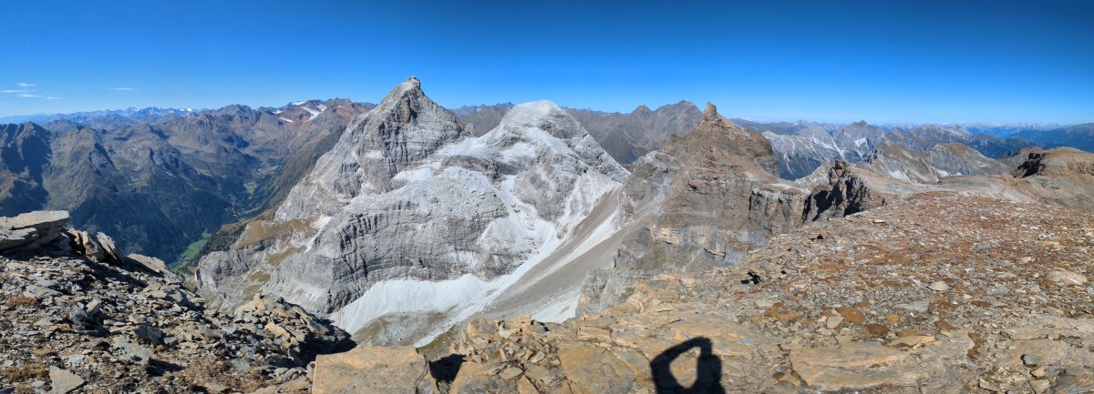 Nach Süden liegen die Stubaier vor uns, insbesondere mit dem wuchtigen Habicht im Vordergrund, und mit dem Zuckerhütl über dem