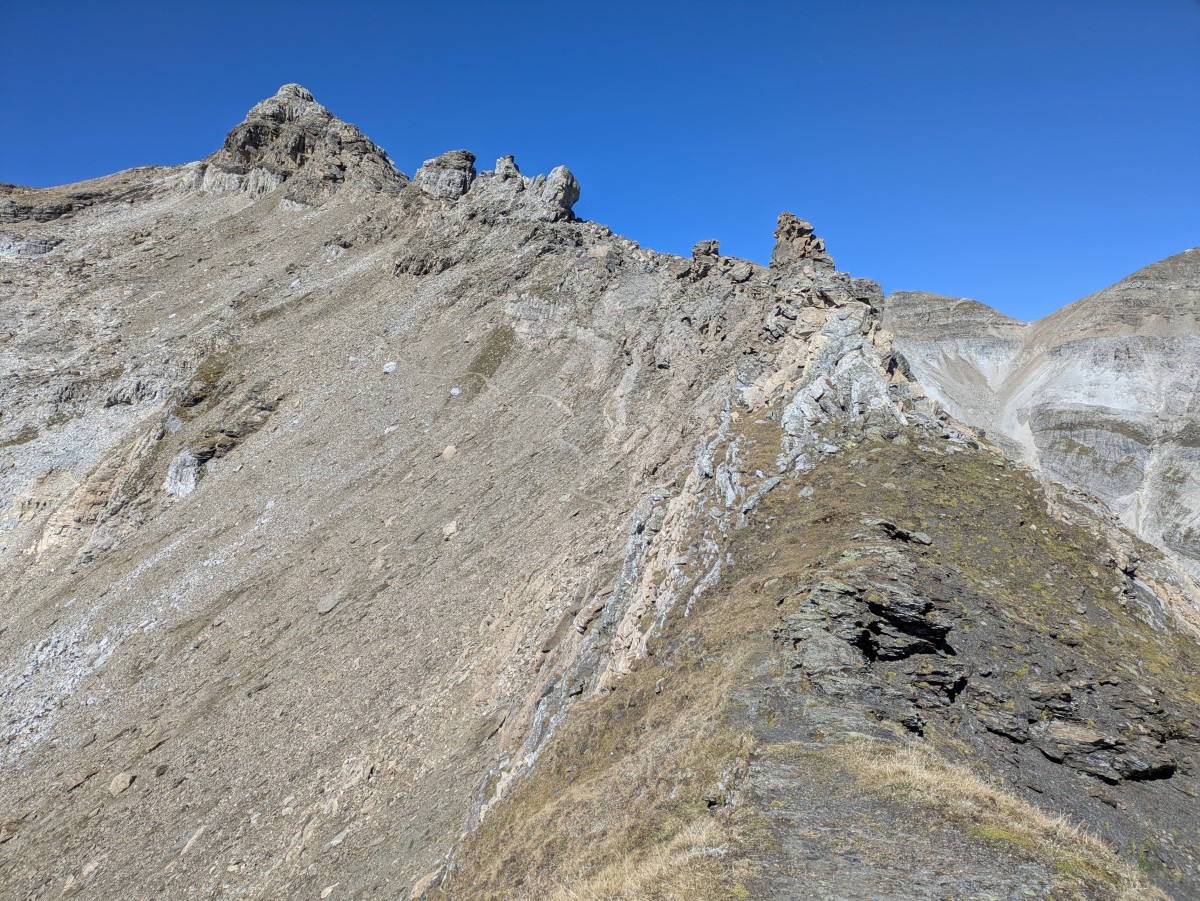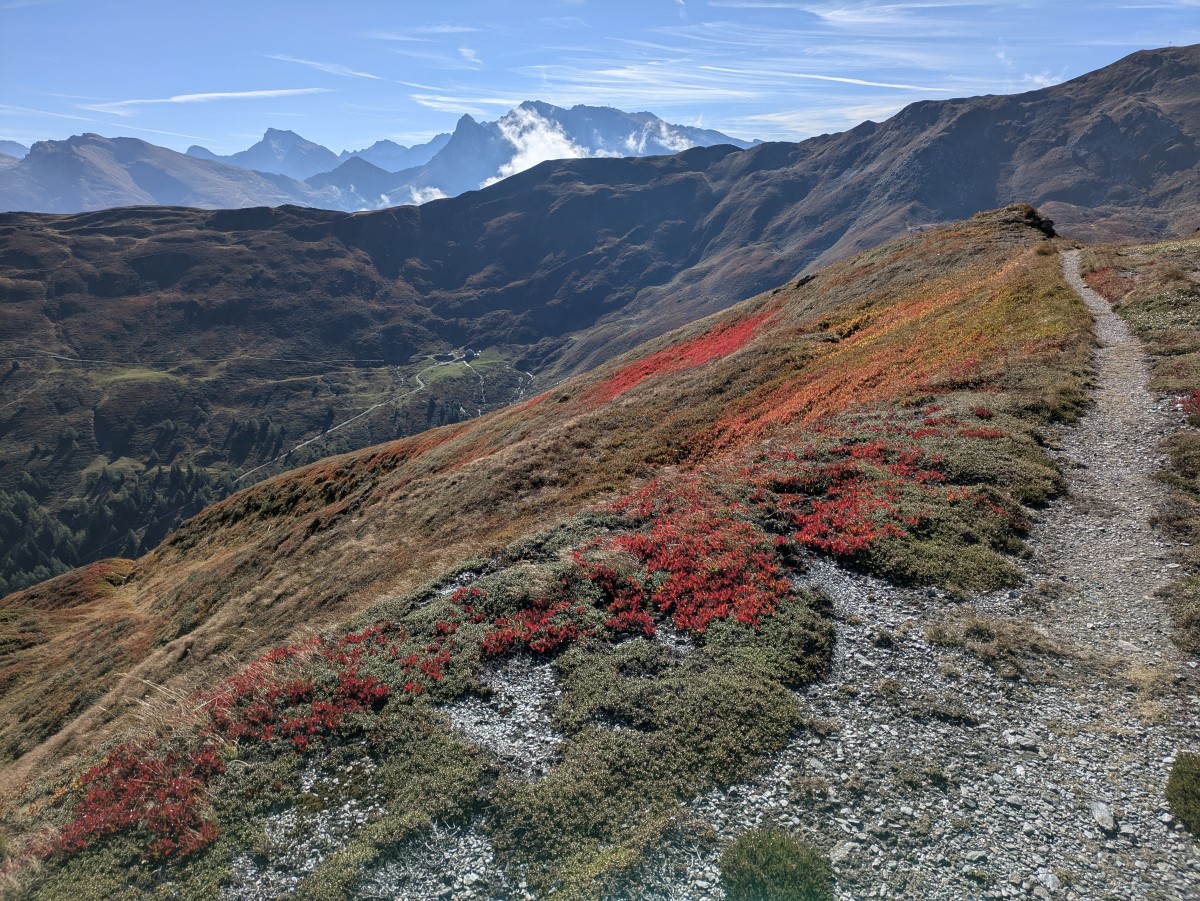 es danach im Bild links von den kleineren Köpfen im Hang nach unten geht. Der Weg ist wunderbar aussichtsreich, erfordert aber