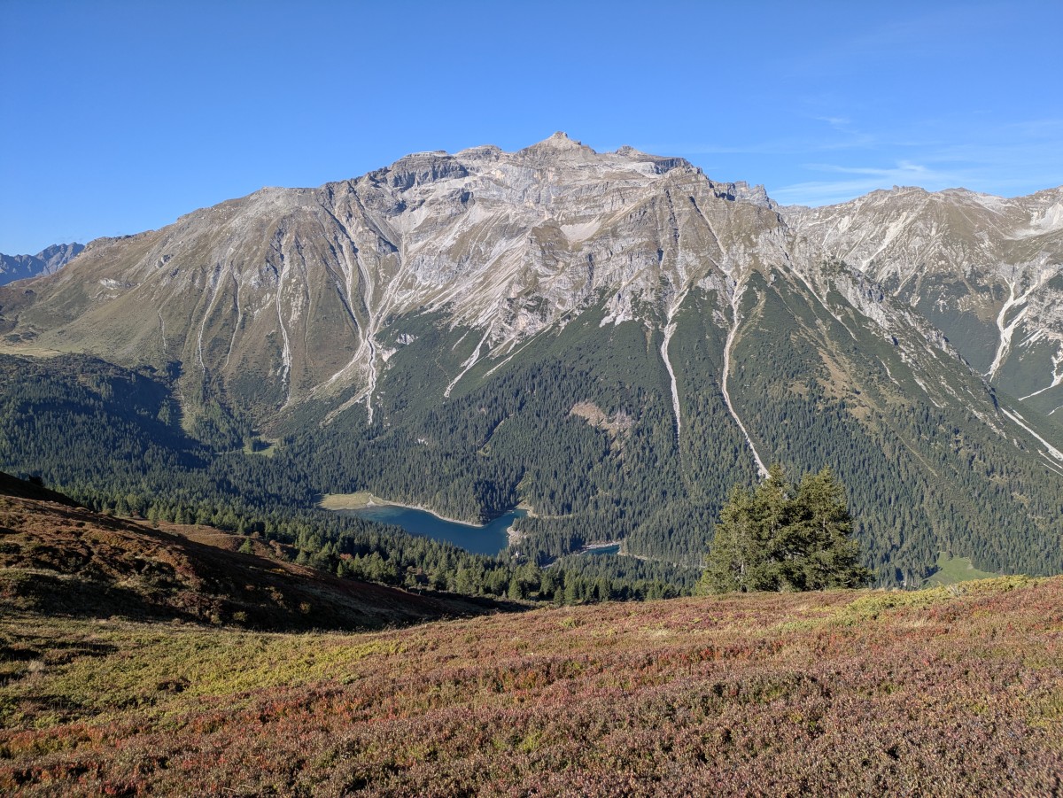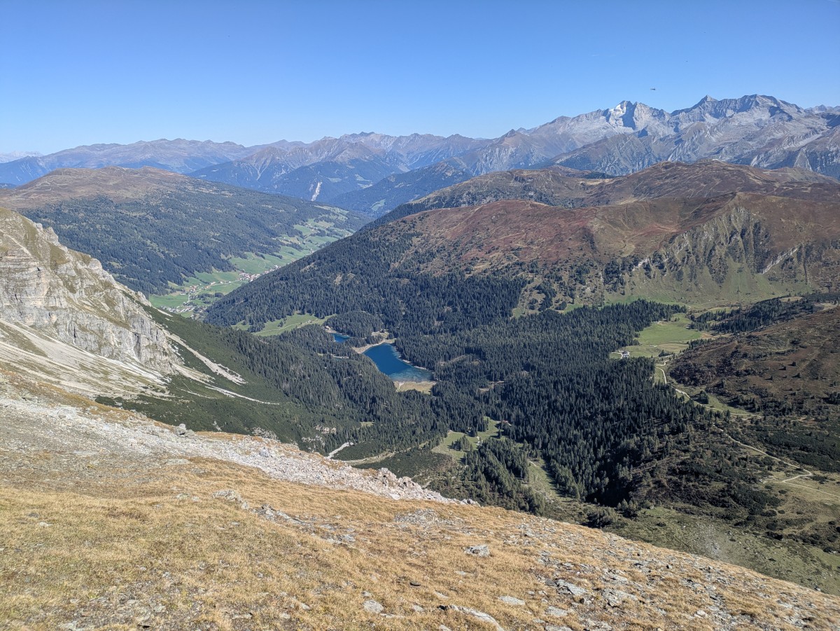 Unter uns leuchtet der Obernberger See tiefblau. Es wird allerdings noch anderthalb Stunden dauern, ehe wir wieder an seinem Ufer stehen.