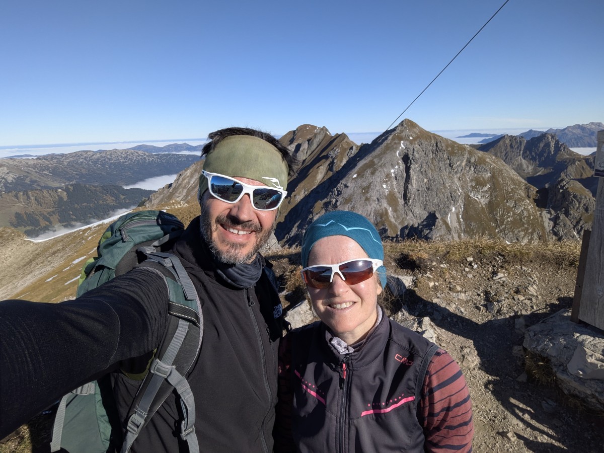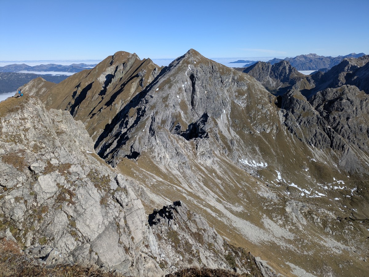 Nach ausgiebiger Gipfelpause am Roßlauf (bei nur wenig Wind, wer hätte das für möglich gehalten!) halten wir uns über den Südgrat