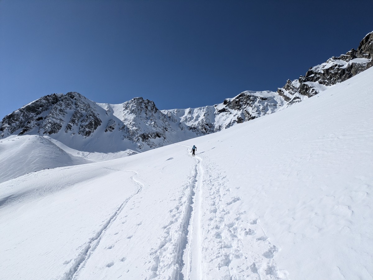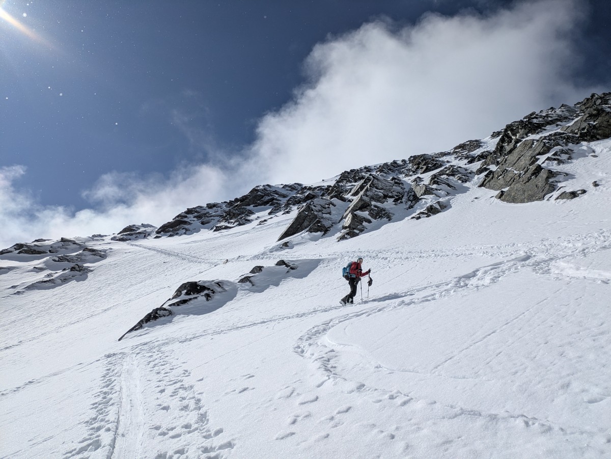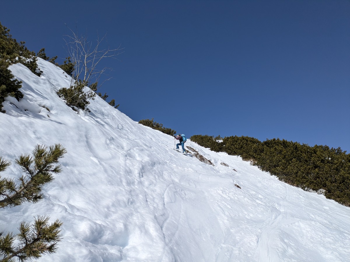 Es ist nicht einfach, bei den schneearmen Bedingungen eine gute Linie nach oben zufinden, aber Richtung Zalimkopf klappt es einigermaßen.