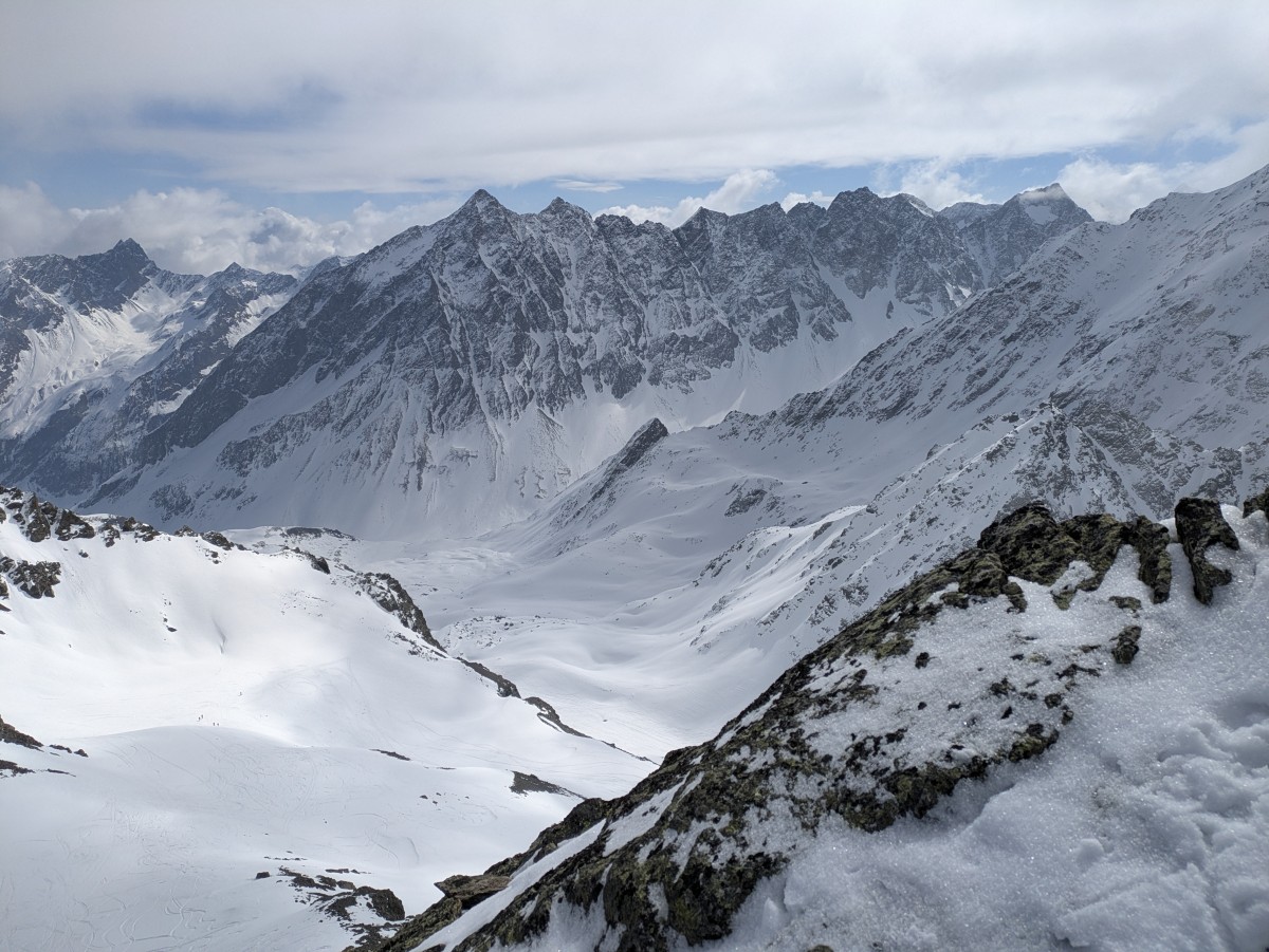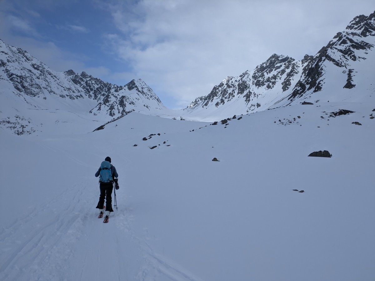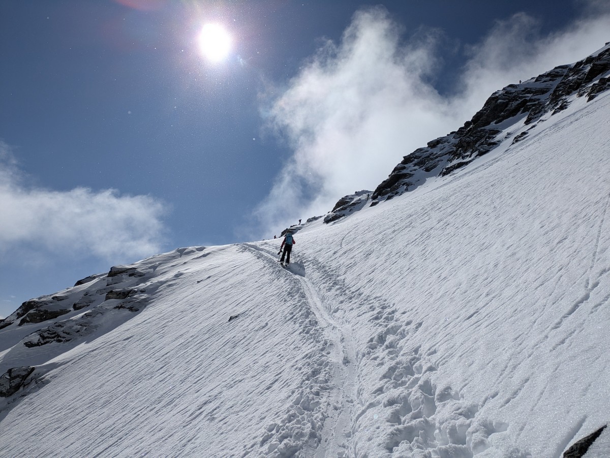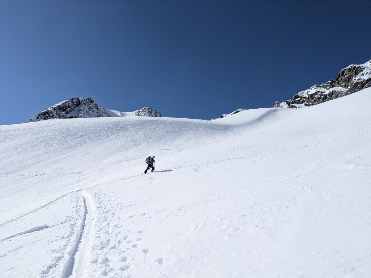 Es ist nicht einfach, bei den schneearmen Bedingungen eine gute Linie nach oben zufinden, aber Richtung Zalimkopf klappt es einigermaßen.