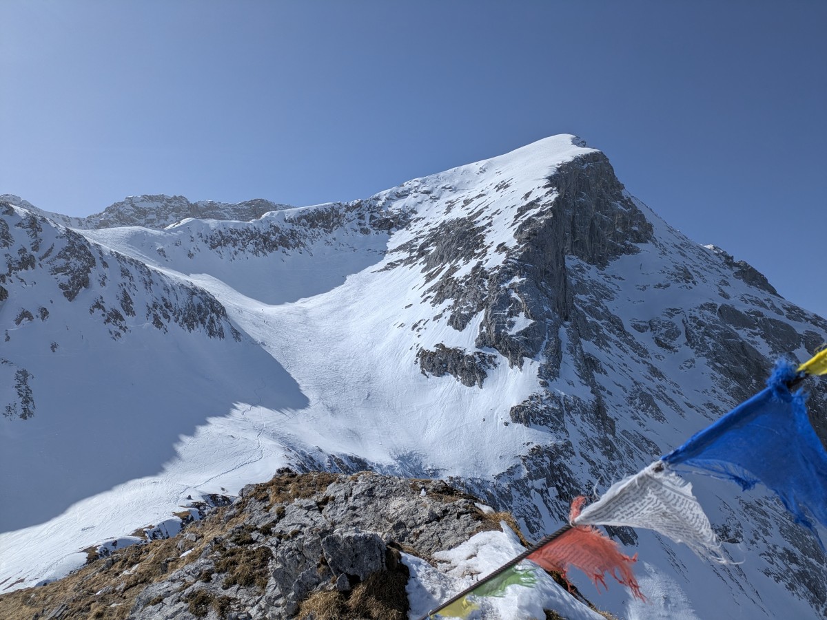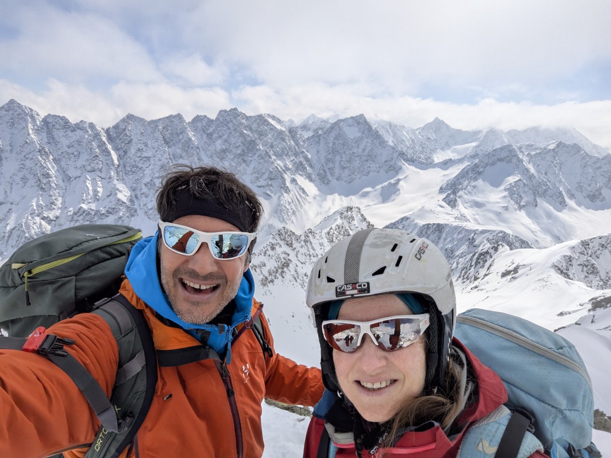 Nach dem letzten steilen Aufschwung zum Gipfel erreichen wir das Skidepot und stapfen unschwierig weiter zum höchsten Punkt. Tatsächlich können wir eine Viertelstunde zu zweit allein die prächtige Rundumsicht bewundern.