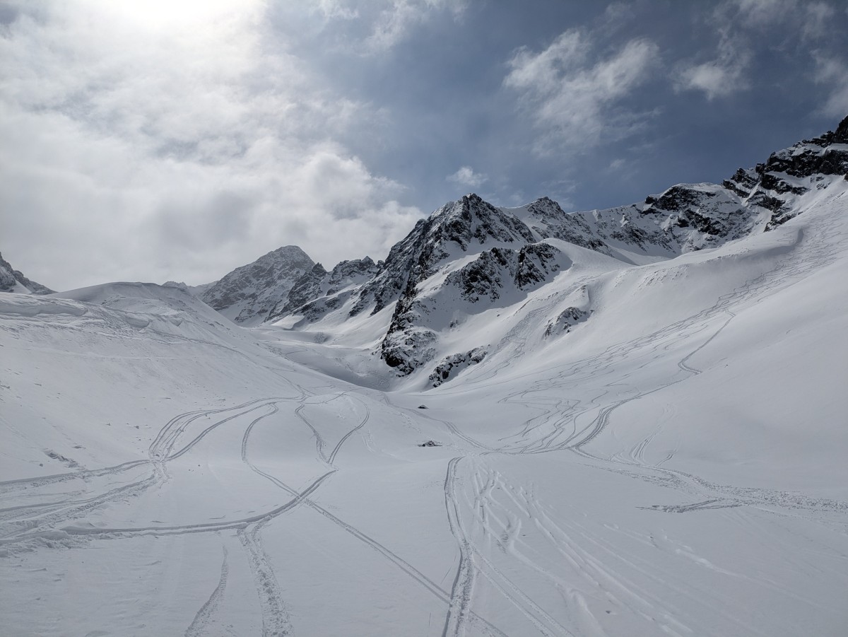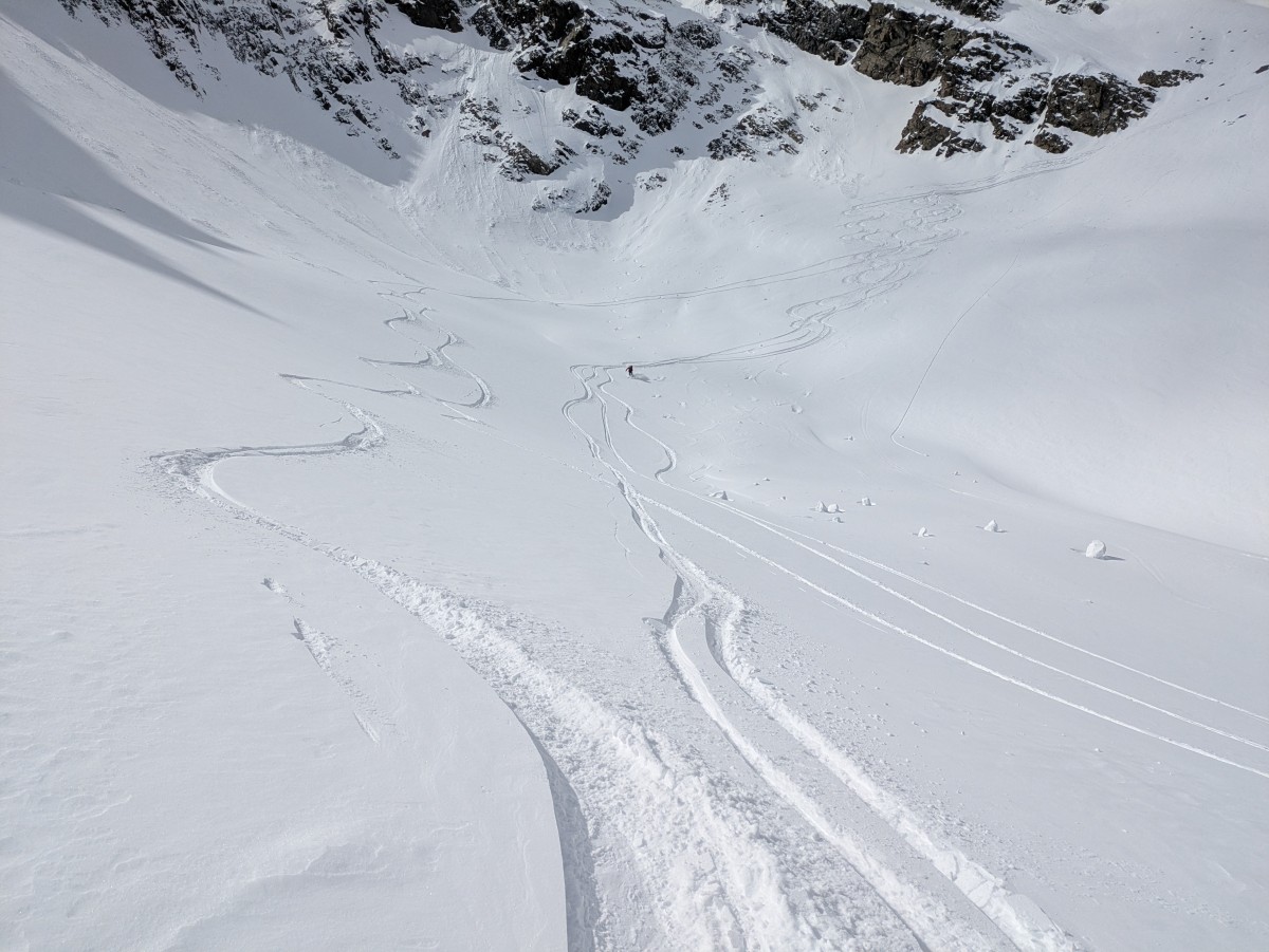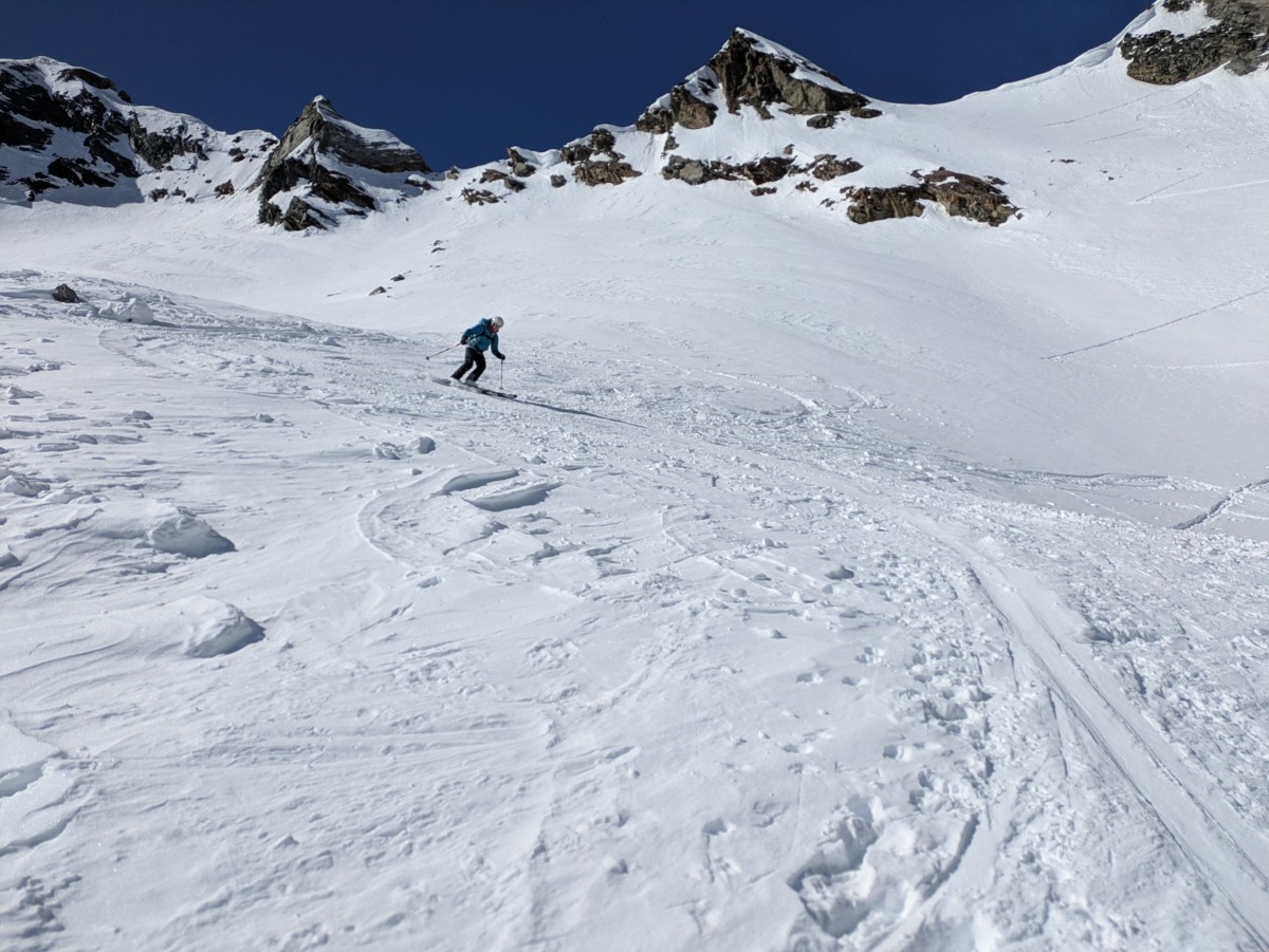 Die gruselig abgeblasenen letzen Hänge bis zum Skidepot lassen wir jedoch auch links liegen. Die Abfahrt ist ähnlich anspruchsvoll
