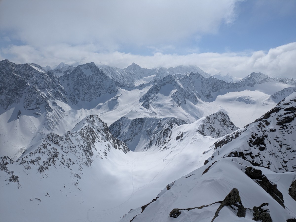 Vom Gipfel der Blick hinab auf die Aufsteigsspur, die dann in den Steilhängen verschwindet.