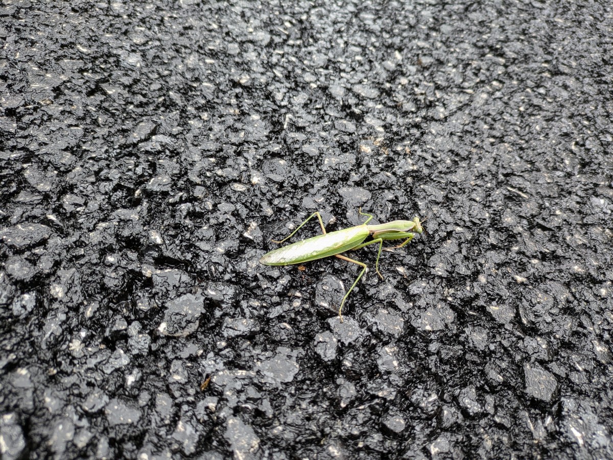 Eine Gottesanbeterin leuchtet grellgrün auf dem Asphalt.