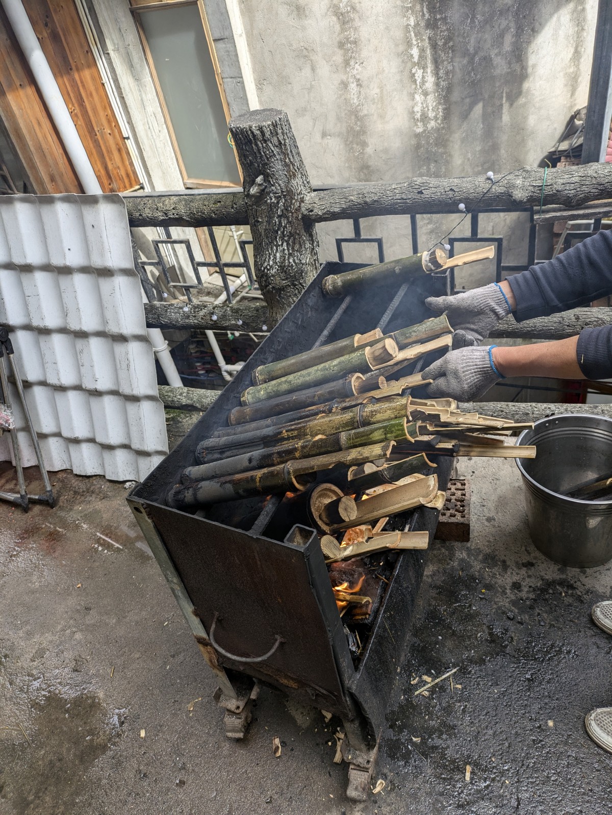 Kurz vor der heiß ersehnten Mittagsmahlzeit beobachten wir, wie Bambus-Abschnitte über dem Feuer erhitzt werden. Was mag das wohl