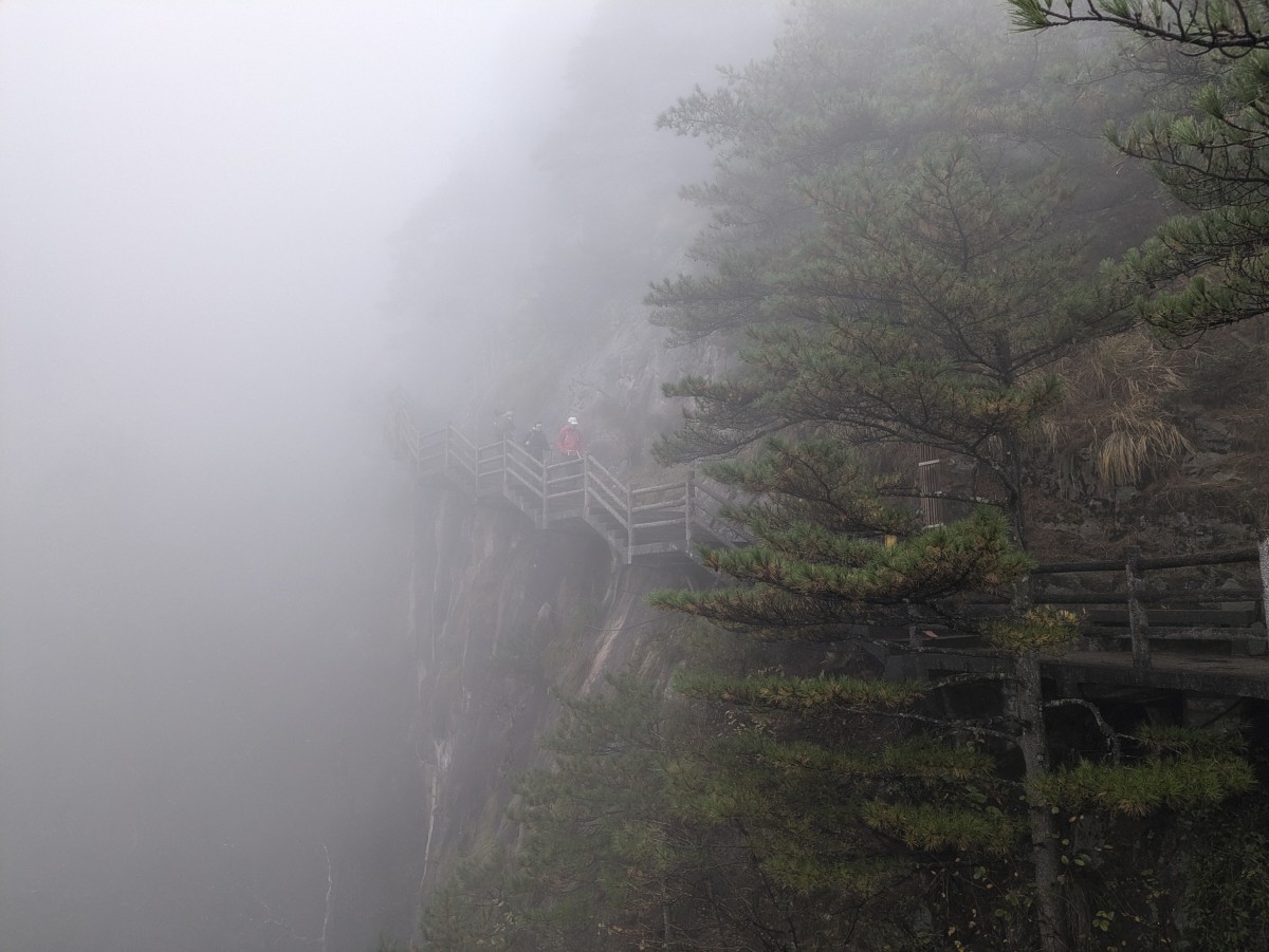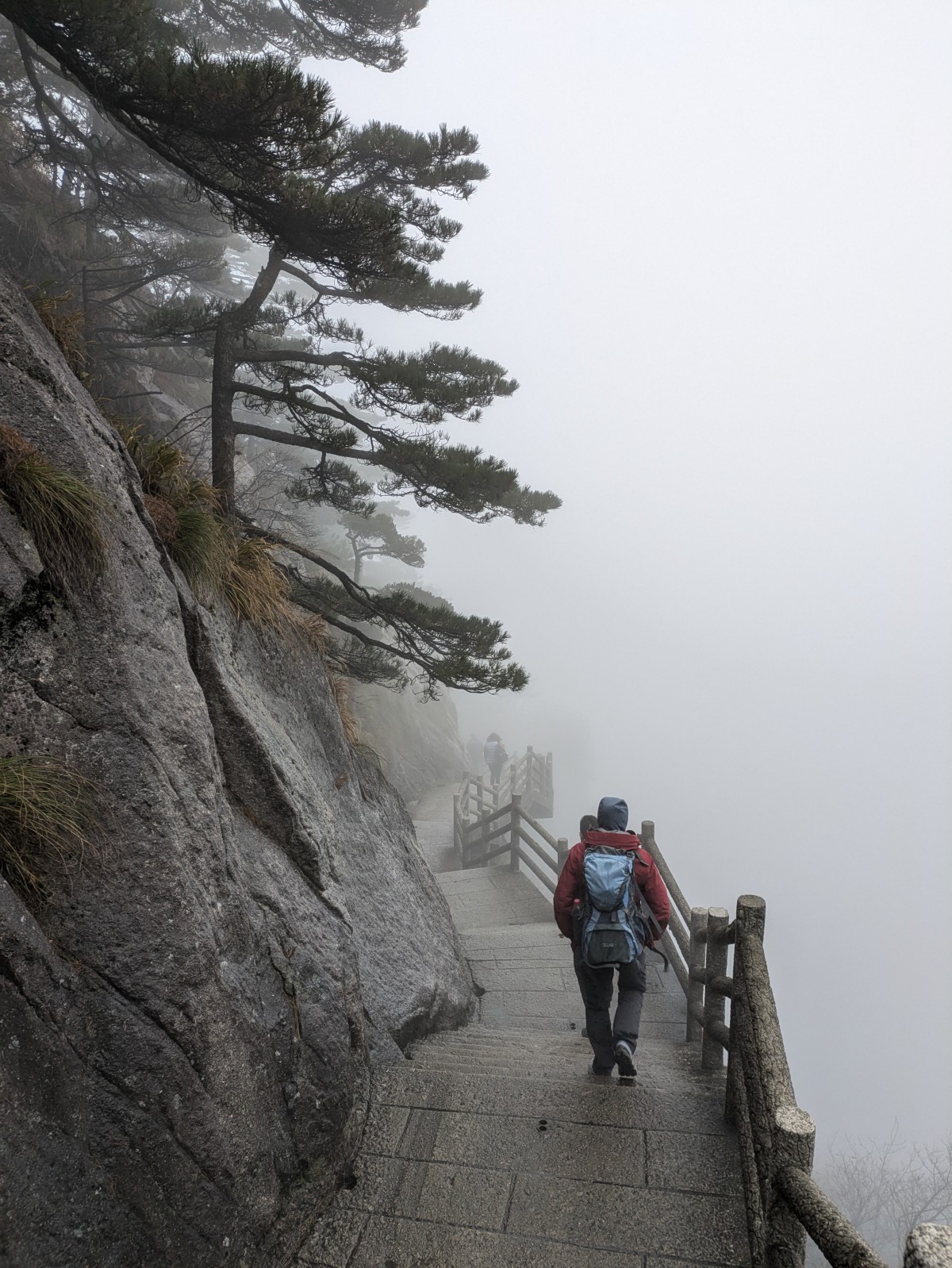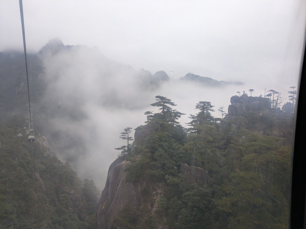 Nach der Übernachtung an Huang Shan geht es am nächsten Tag durch die Nebelsuppe so schnell wie möglich zurück zur Gondelbahn.