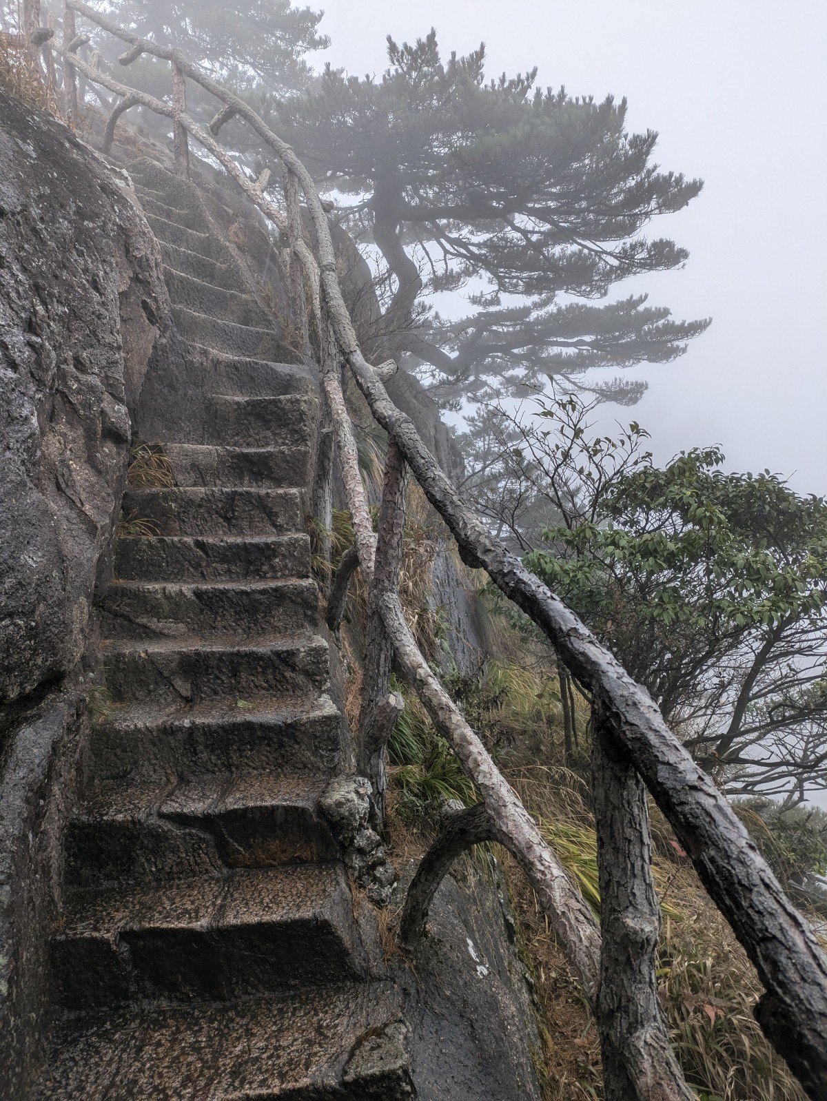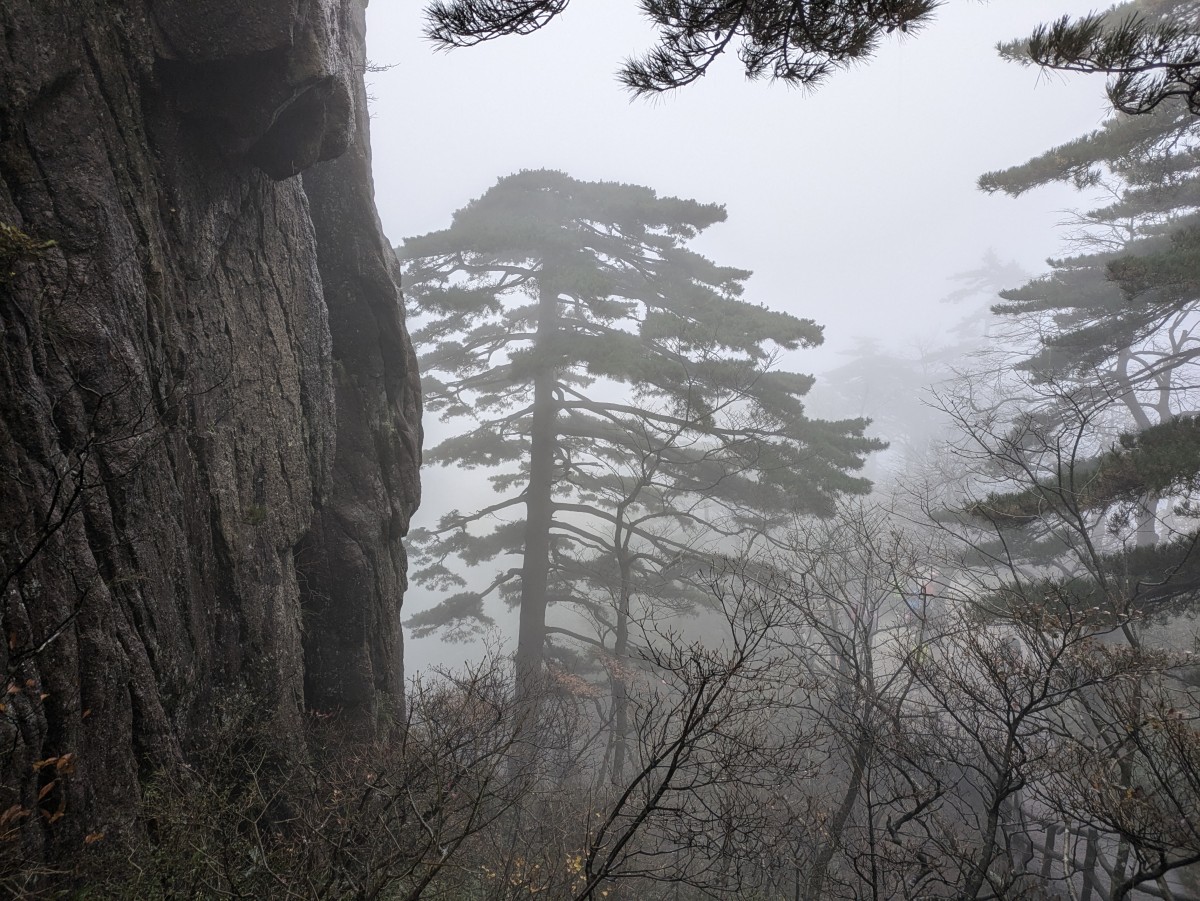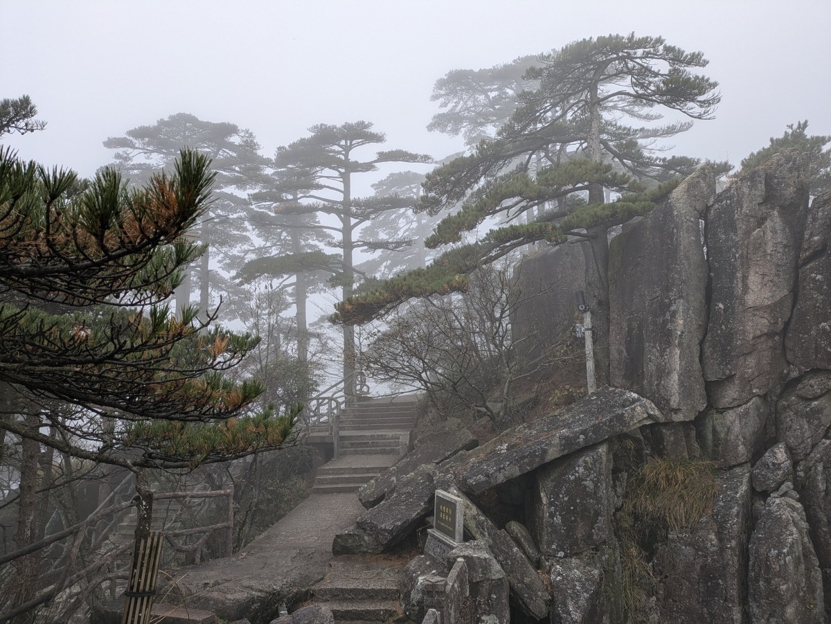 Nach der Übernachtung an Huang Shan geht es am nächsten Tag durch die Nebelsuppe so schnell wie möglich zurück zur Gondelbahn.