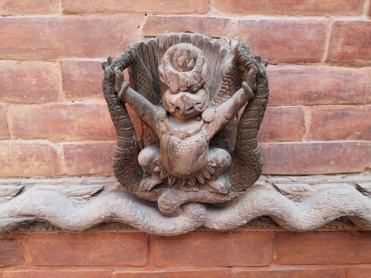 Der querlaufende Balken ist mit dem Leib einer Naga-Schlage verziert, während das darüberliegende Balkenende den menschlichen Oberkörper trägt.