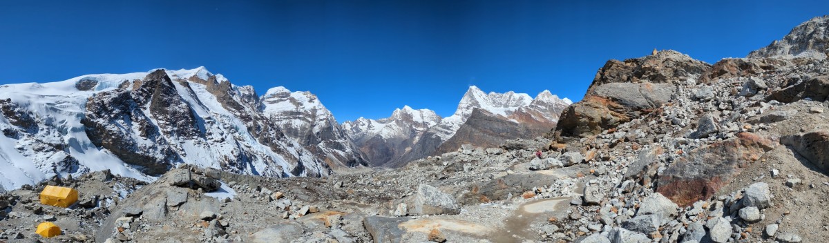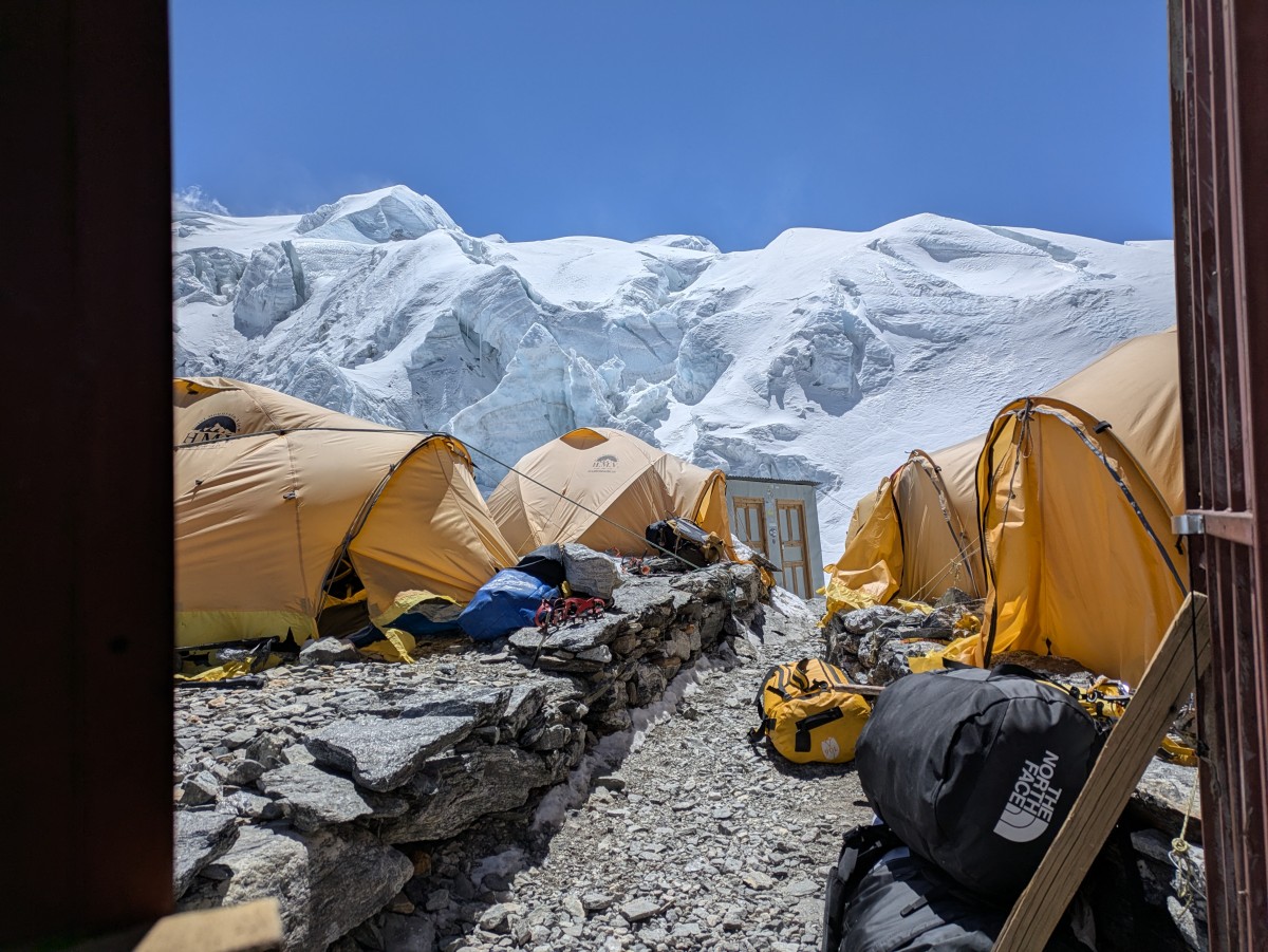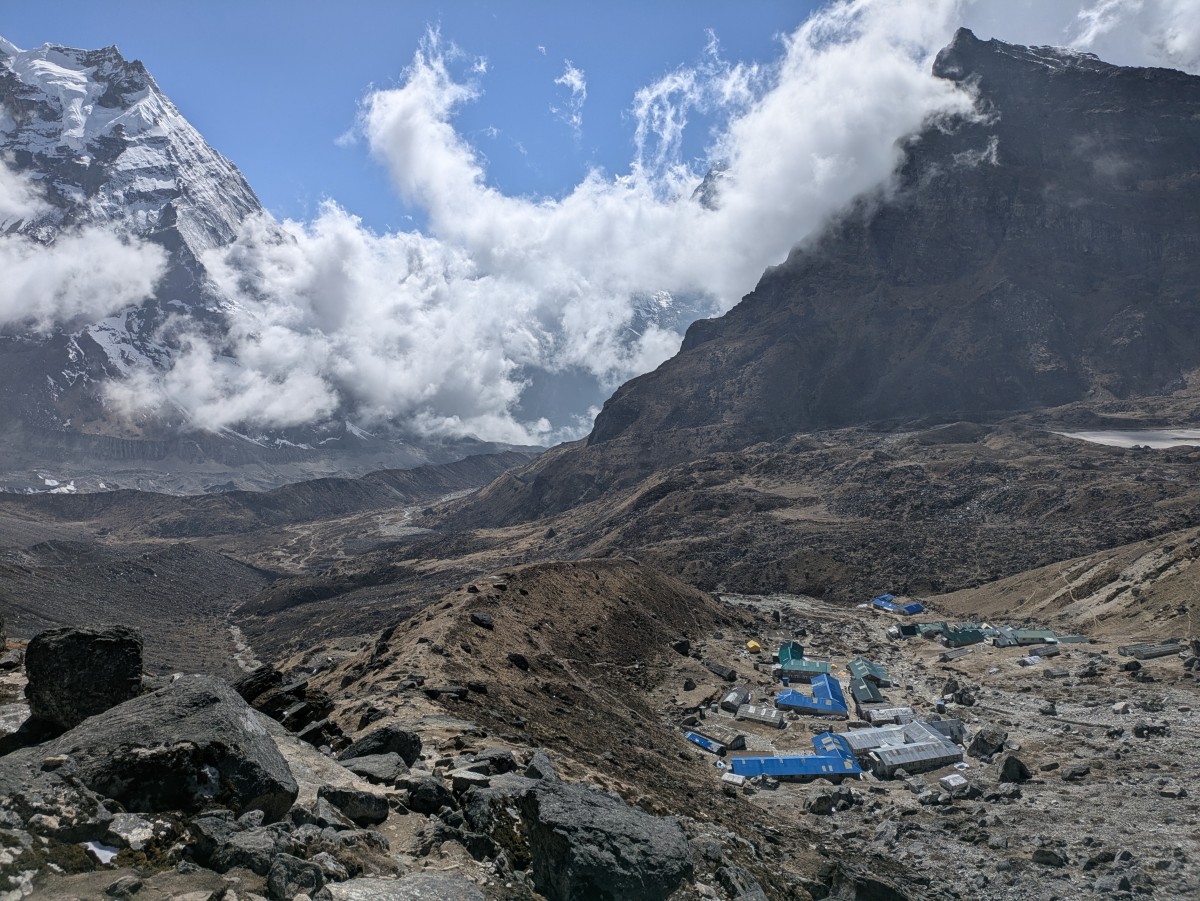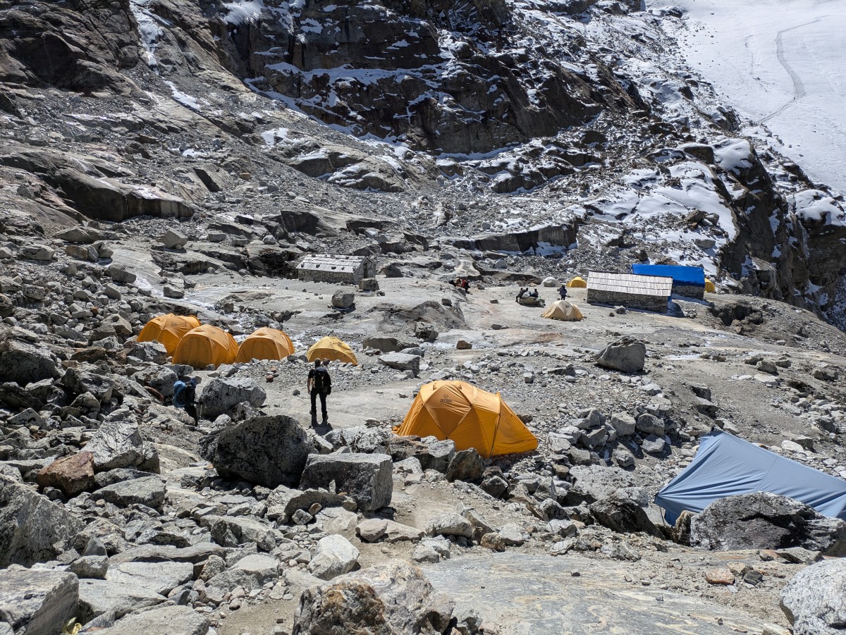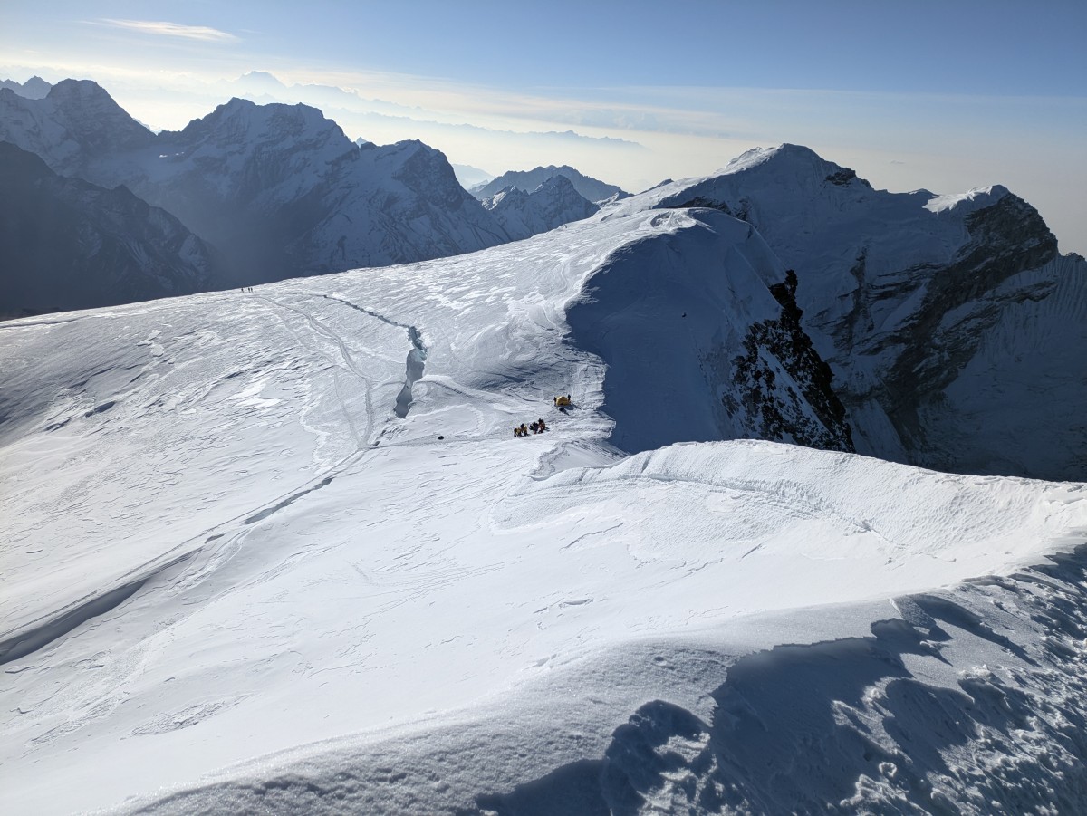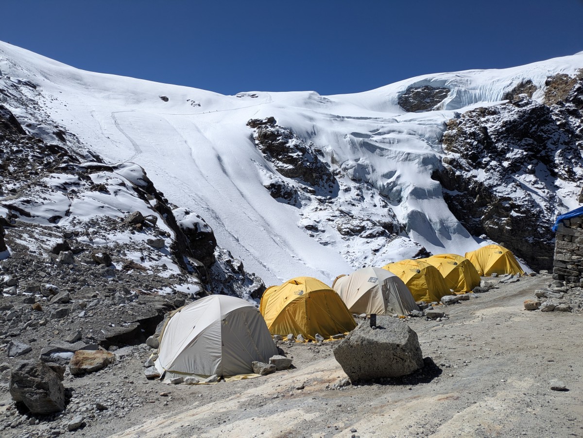 Der bullige Chamlang thront über dem winzigen High Camp unten links im Bild.