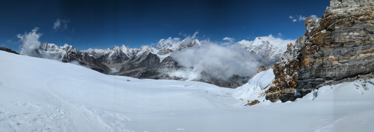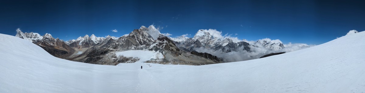Richtung Osten - rechts bereits das Massiv des Mera Peaks, in der Bildmitte der Mera La, und links namenlose Sechstausender.