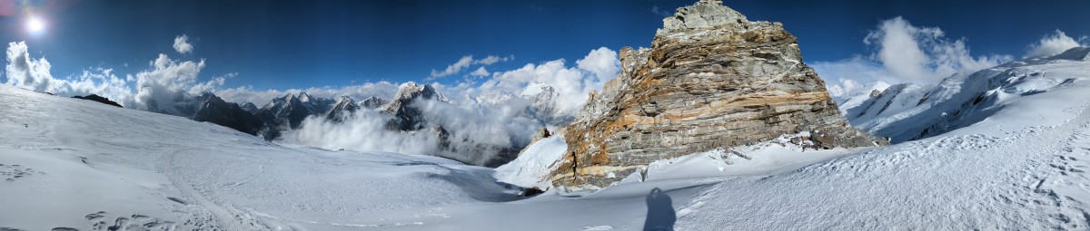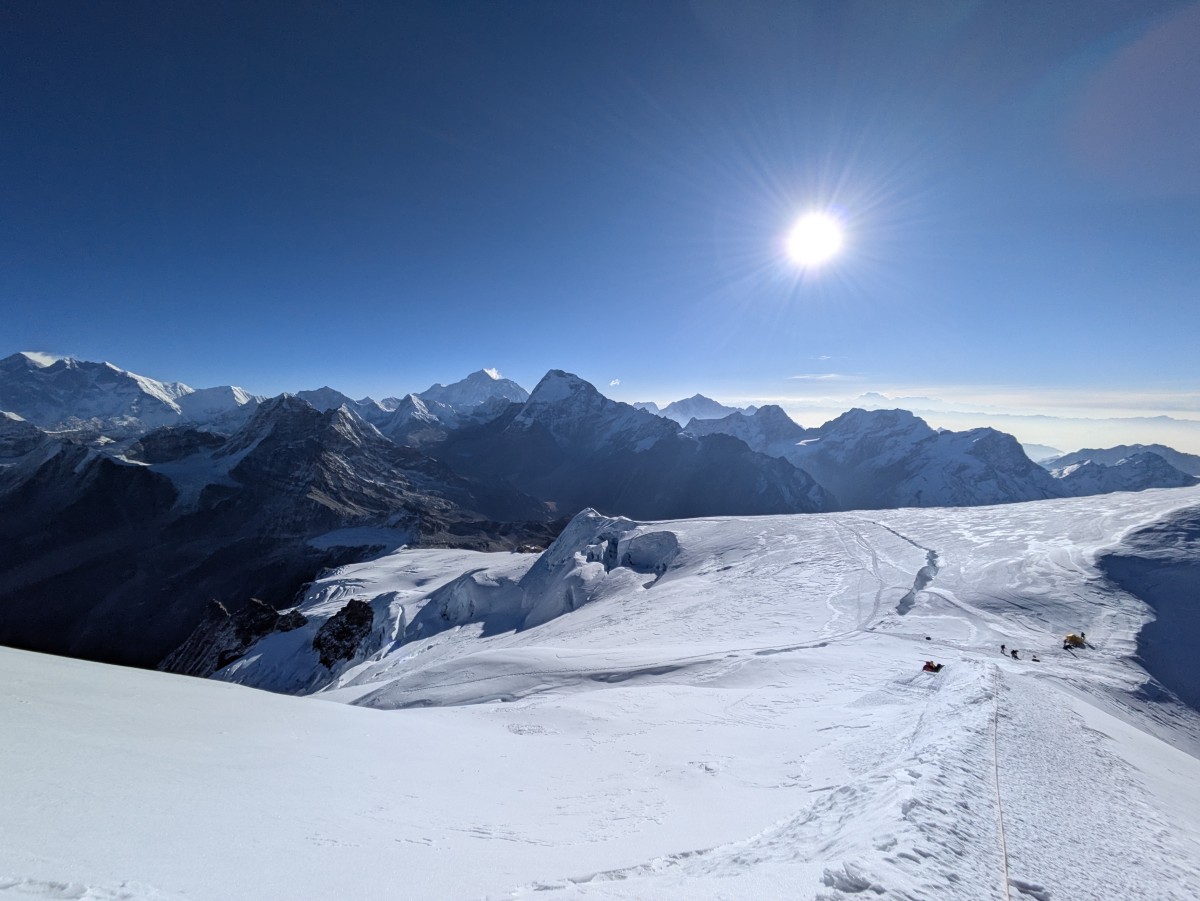 Mittelgipfels. Von dort aus sehen wir endlich auch den fünften Achttausender, den Kanchendzönga; im Photo ist der dritthöchste