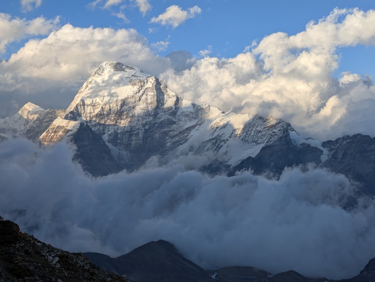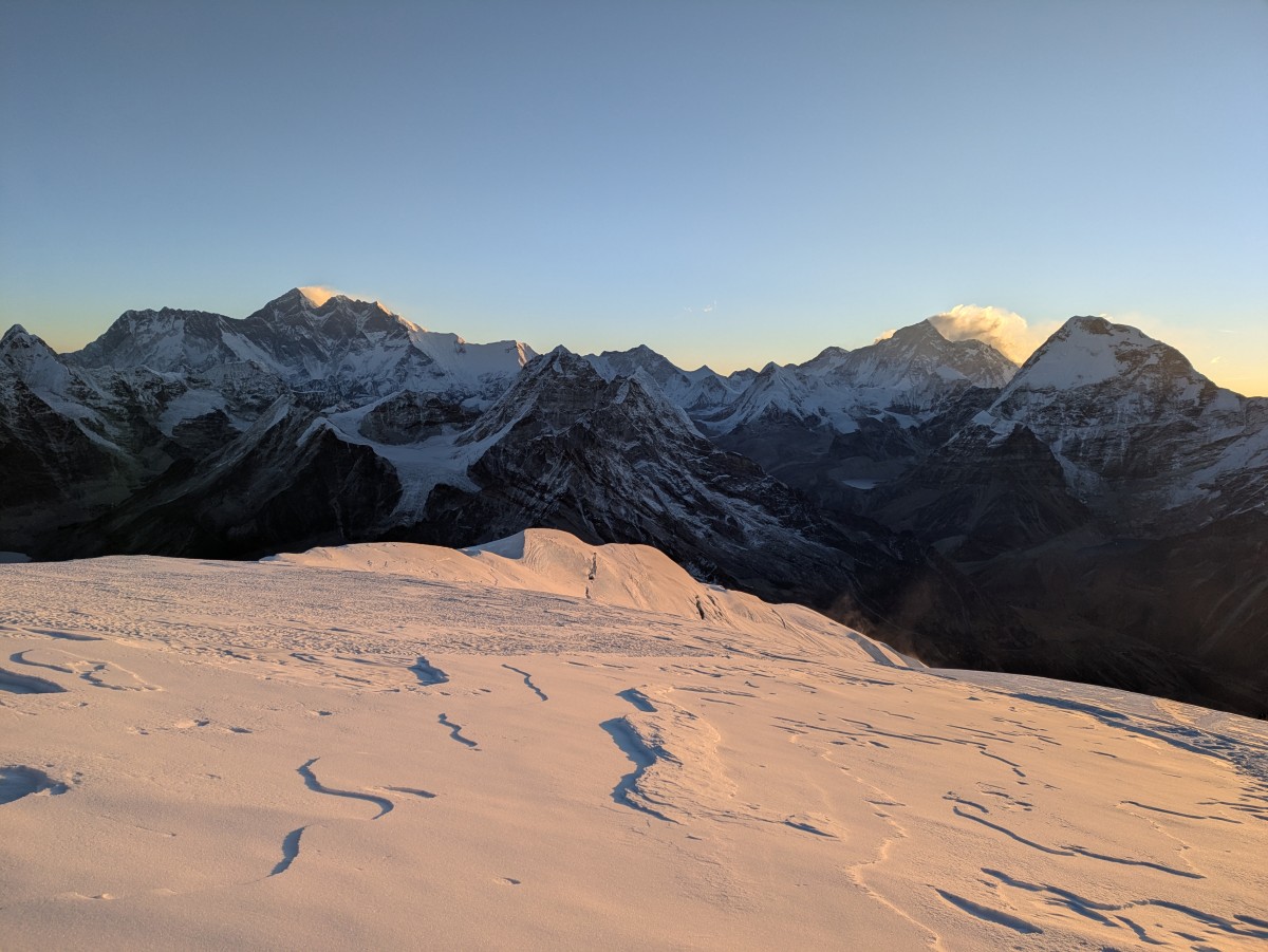 Blick hinüber zum stark vergletscherten Naulekh, einem Nachbargipfel zum Mera Peak.