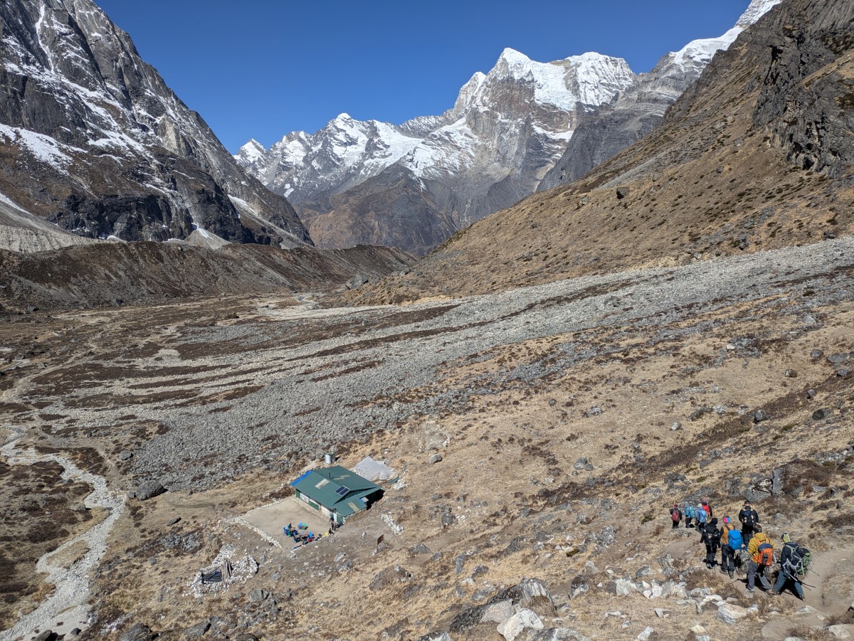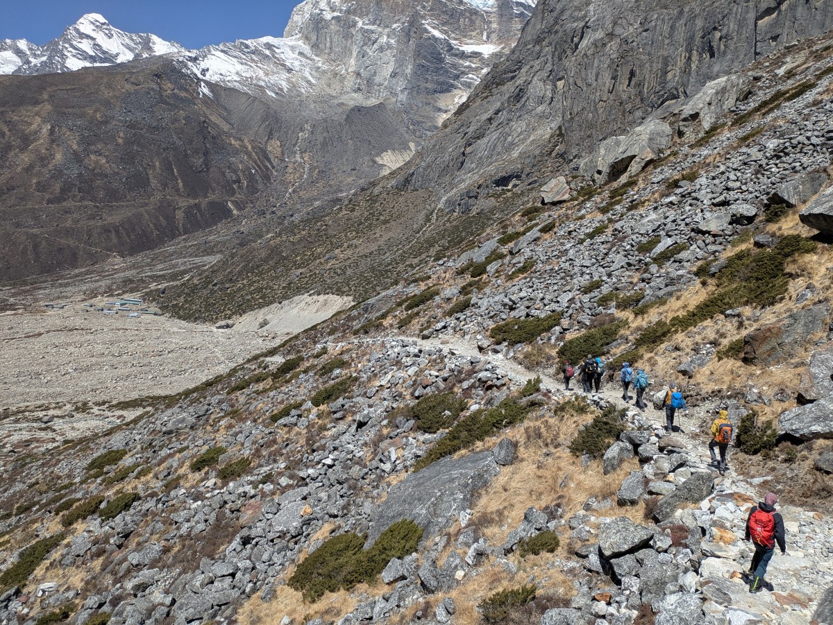 zehn Uhr vormittags wieder hinunter nach Khare geht. Dort laufen wir nach Mittag ein - das Gipfelabenteuer ist gesund und