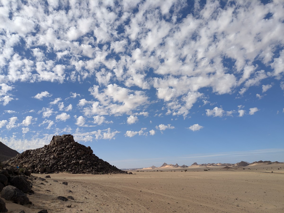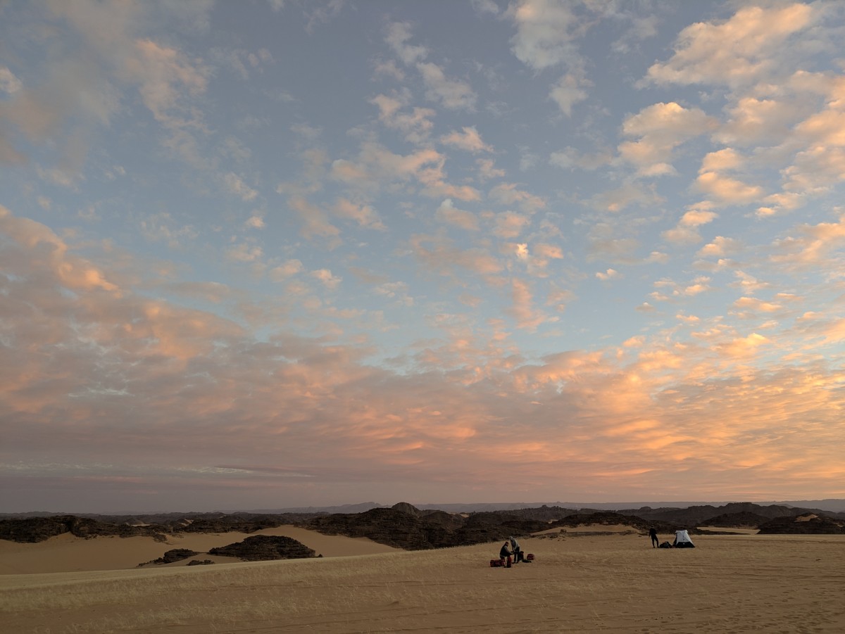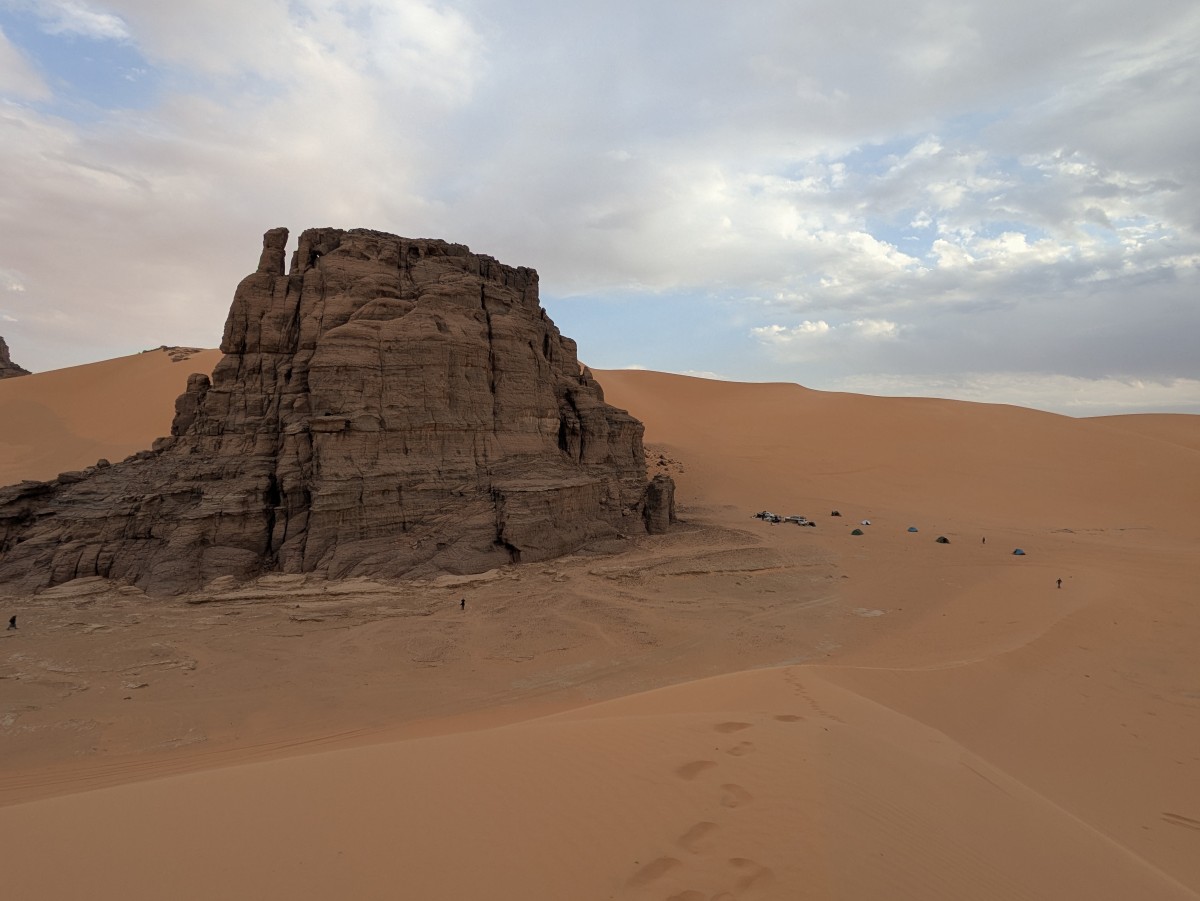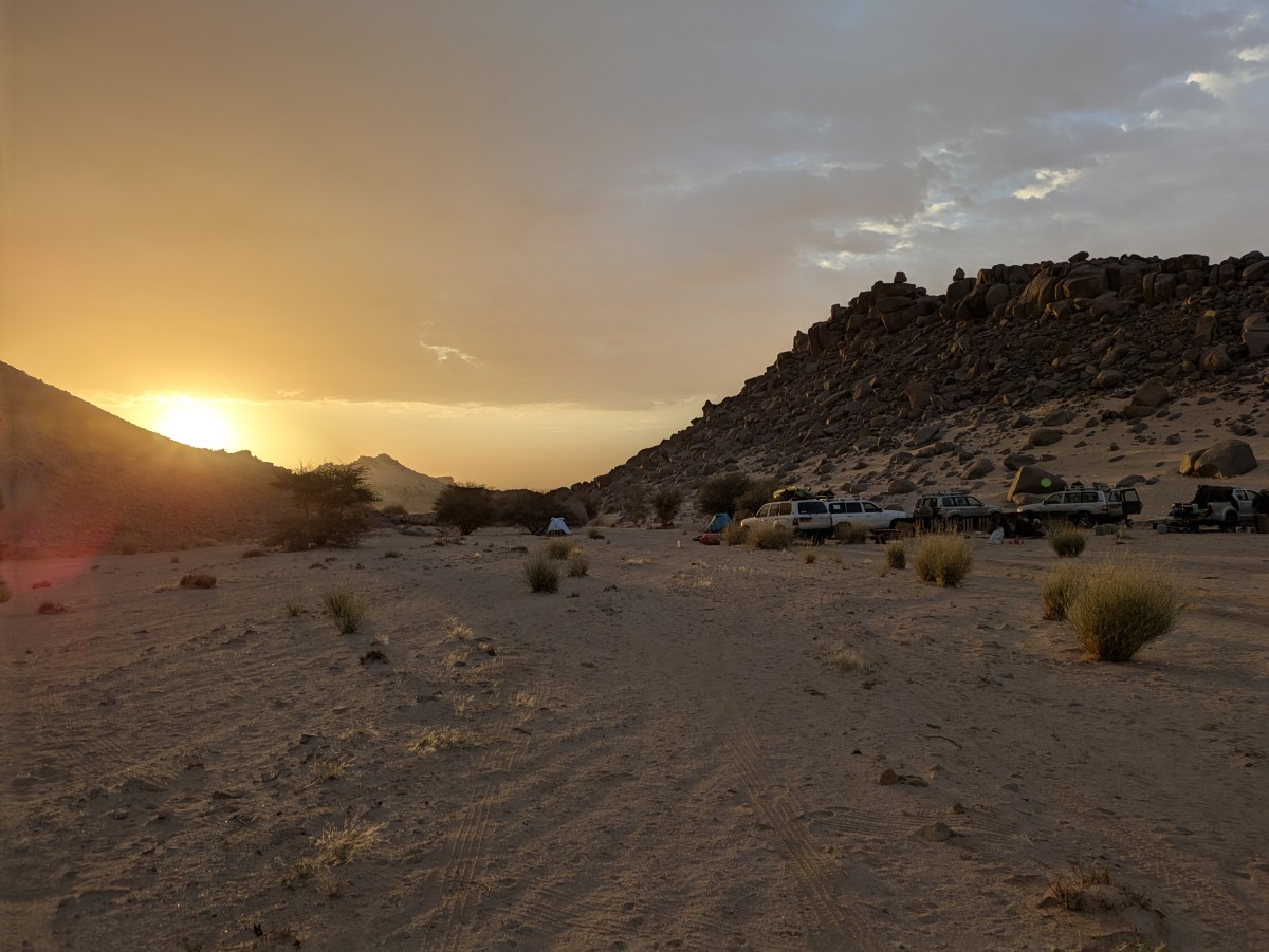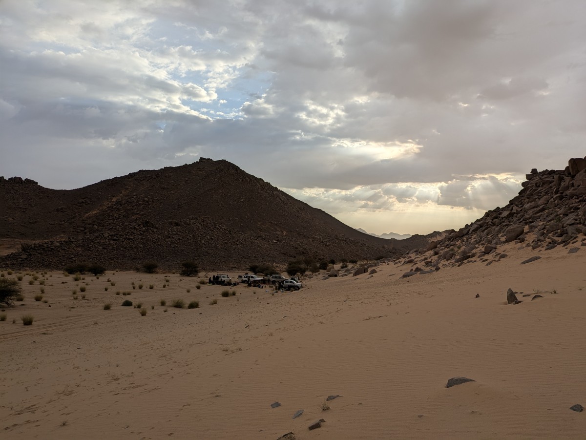 Keinen Kilometer von Moul Naga enfernt schlagen wir unser Lager in einem gigantischen Windkolk auf, der sich um eine hohe