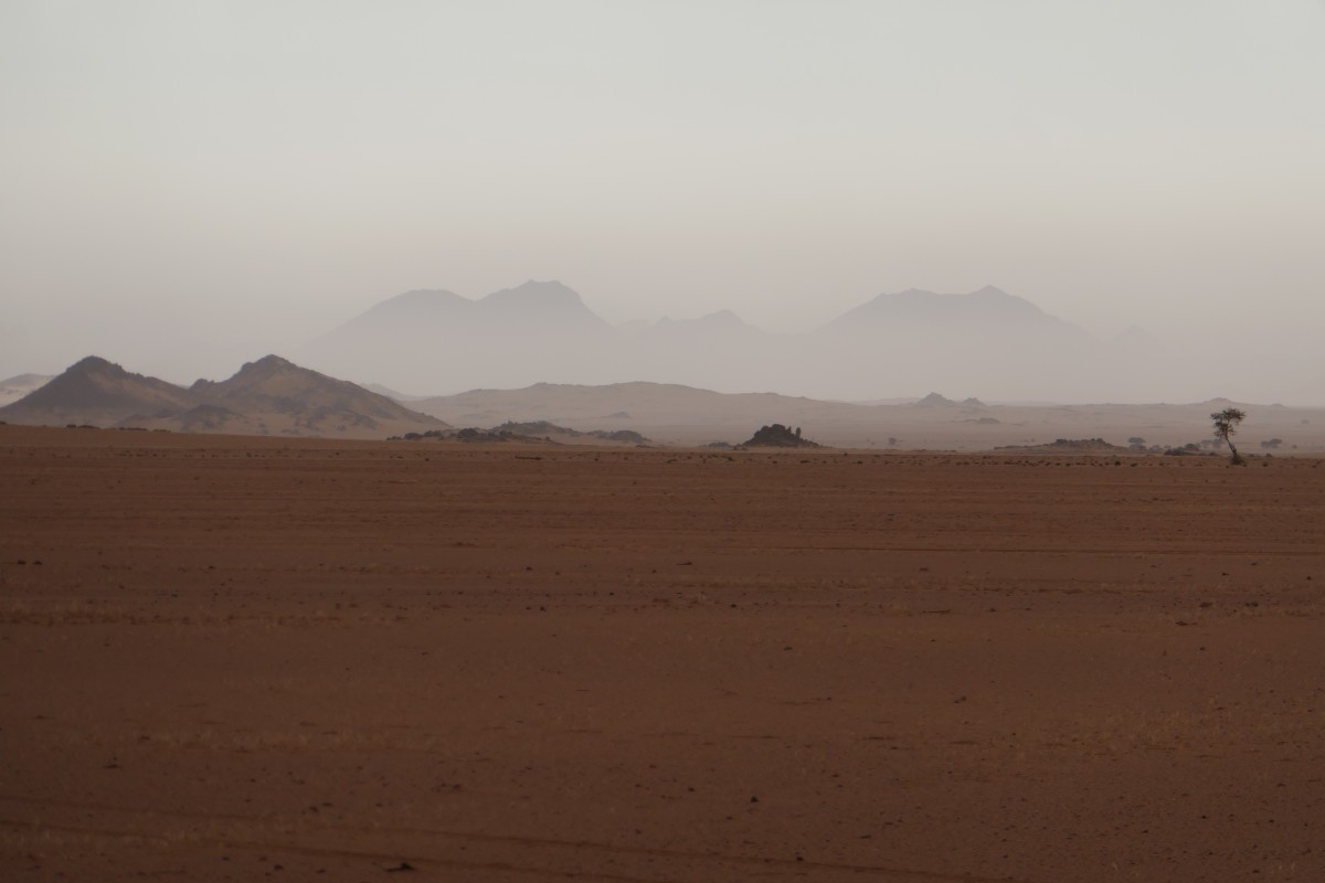 Reichlich verloren schweben die hohen Erhebungen am Horizont über der kahlen Fläche.
