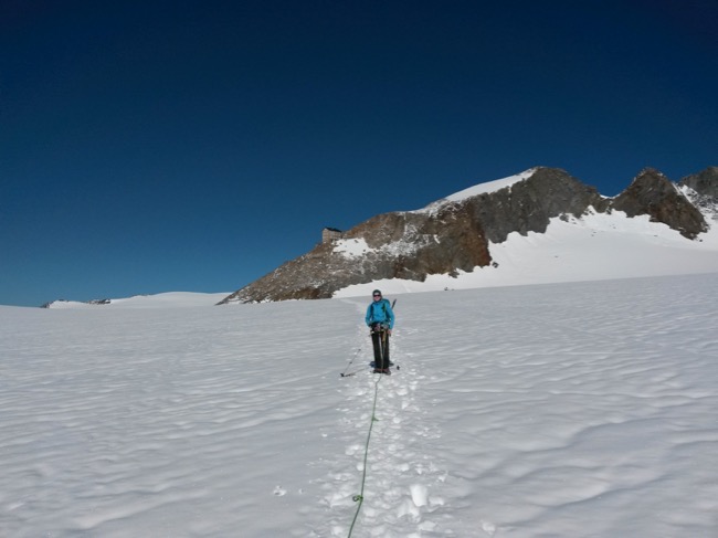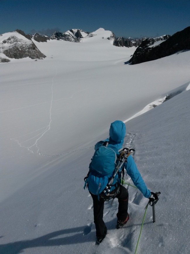 Der Gletscher läuft relativ flach und griffig dahin. Wir kommen gut voran und haben