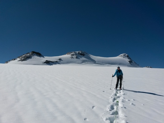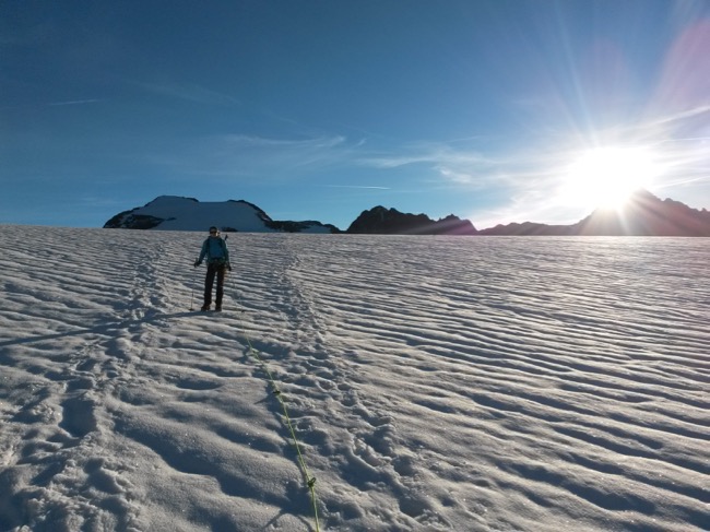 Nach etwa 200 Metern über einen schön aufgefirnten Gletscher erreichen wir den kleinen