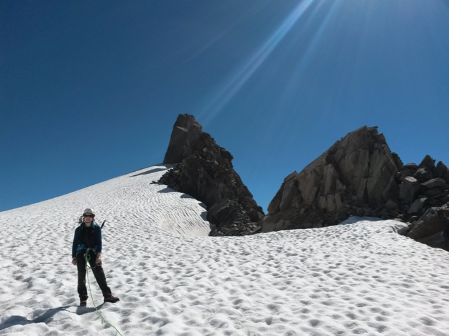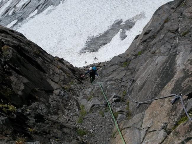 Nach einem kurzen und unschwierigen Gletscherstück kommen wir an die Schlüsselstelle