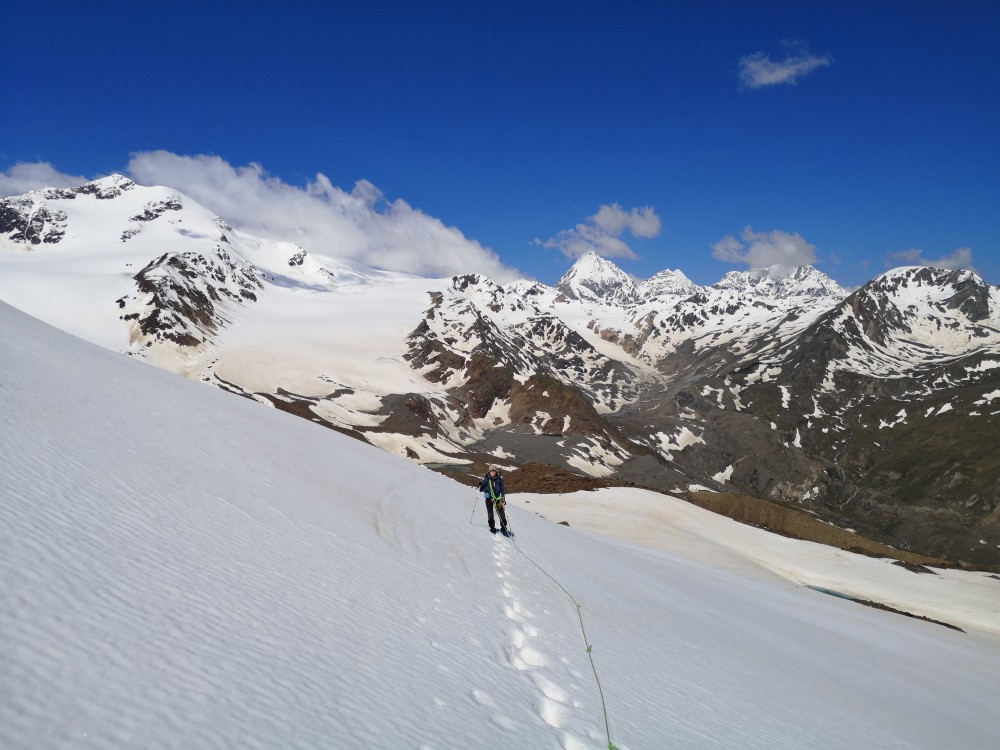 Die schöne Wanderung führt uns über die Dreitausender-Schwelle auf einen weiteren Logenplatz vor den umgebenden Schneebergen.
