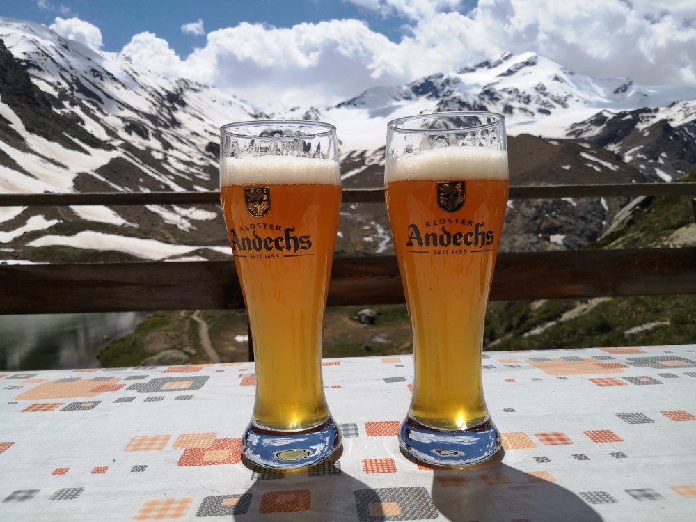 Wir kehren an der Martell-Hütte ein und sinnieren bei einem kühlen Getränk über die Tour zur Zufall-Spitze, die vor uns im Bild