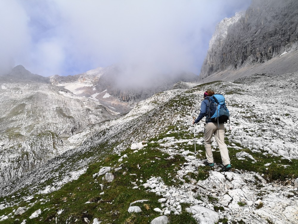 Schneefelder queren, die auf den steilen Schutthängen liegen. Glücklicherweise sind diese Reste weich und gut zu treten,
