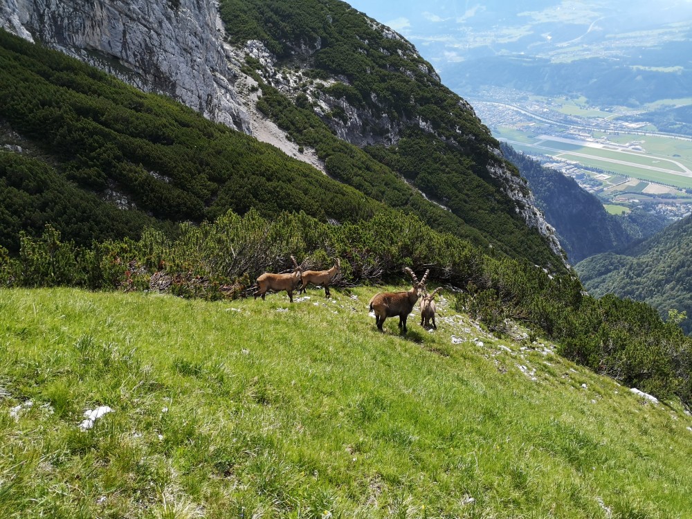 Gesellschaft. Links des Weges schauen uns in etwa zehn Meter Entfernung vier Steinböcke an! Die Tiere sind eher