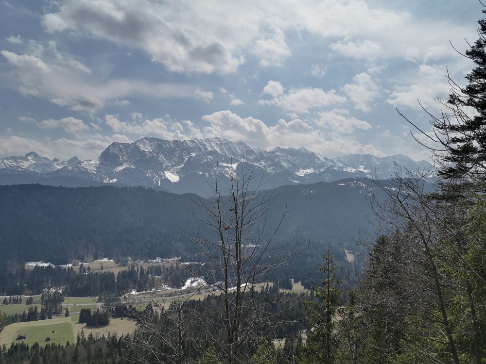 Der Blick nach Wallgau und Krün gleitet über Wiesen, denen der Winter noch gut anzusehen ist. Es wird noch etwas dauern, bis frisches Grün mitsamt Blumen zu