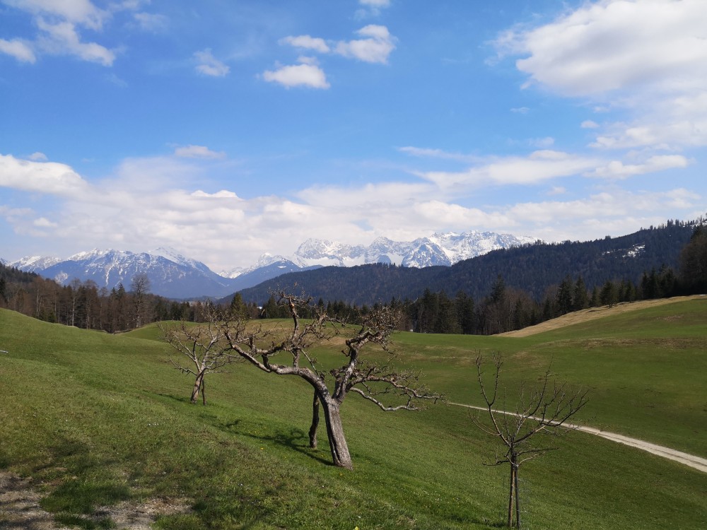 Am Gschwandtnerbauern geht unser Blick über die noch kahlen Obstbäume hinüber durchaus sehnsüchtig zum Mittenwalder Karwendel. Noch sind die Grenzen