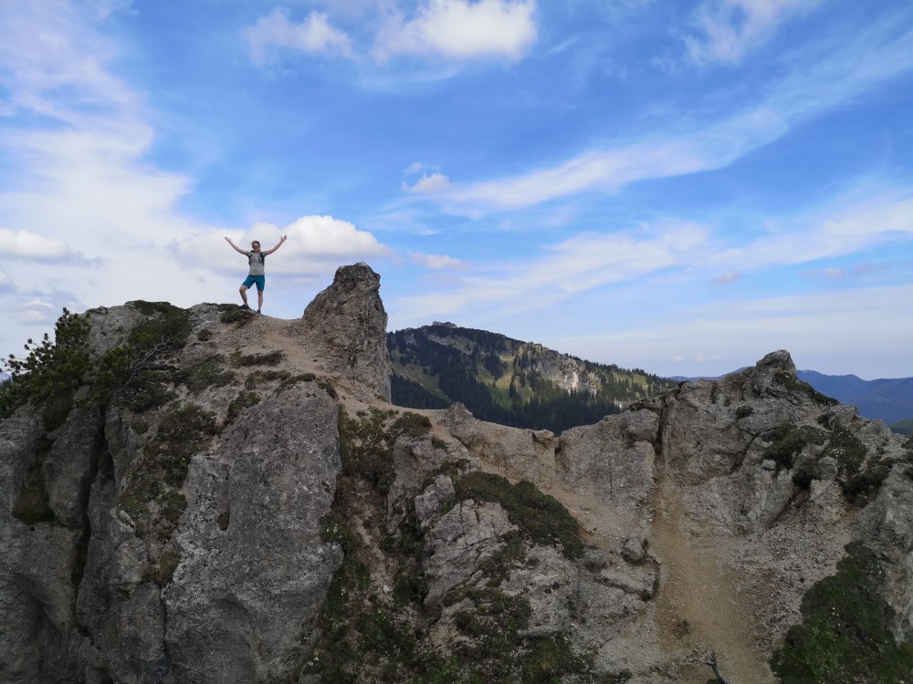 Am Gipfel angeommen schauen wir nach Hochplatte und Kreuzspitze - vertraute Ammergauer Ziele.