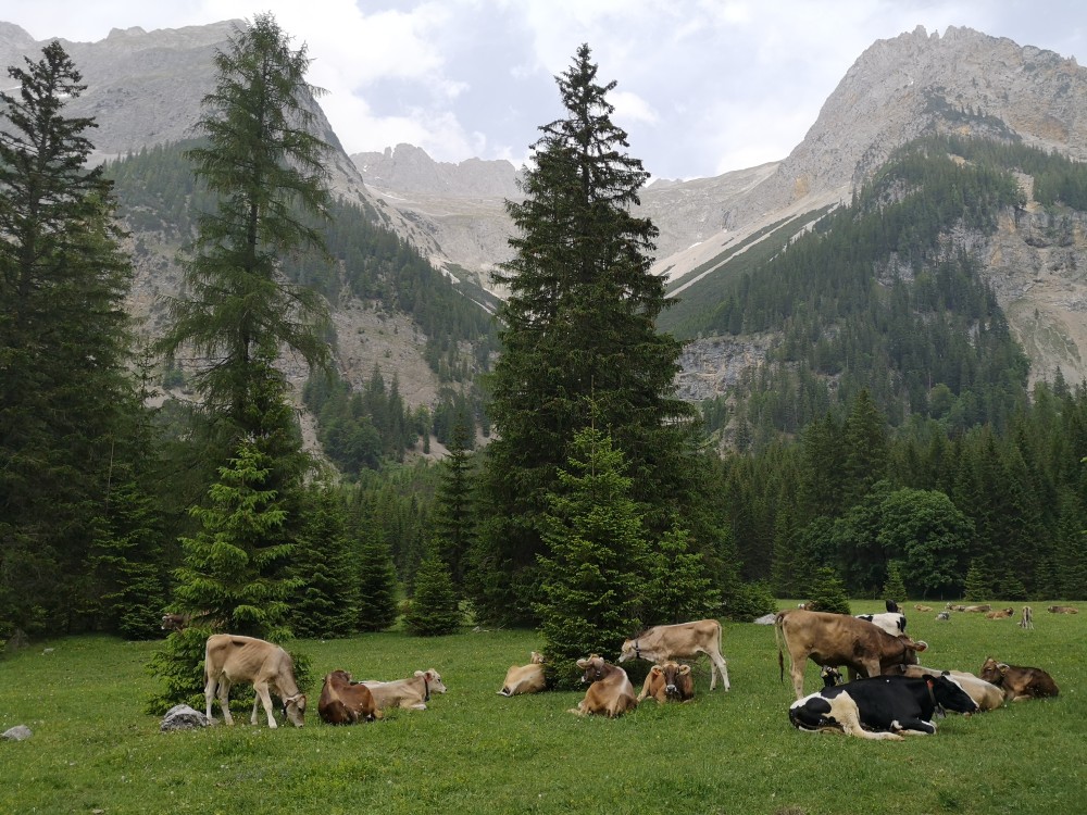 Im Tal dokumentiere ich noch zufriedenes Jungvieh vor dem Kar zur Raffelspitze. Eine schöne Tour geht zu Ende, und wir kommen trocken in Scharnitz an.