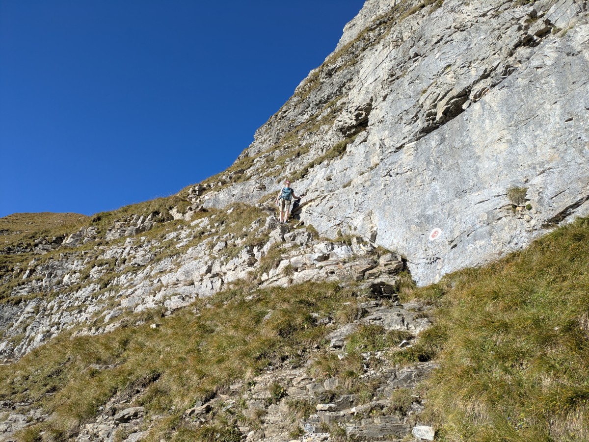 wieder bergab. Den linken, etwas größeren Felskopf überwinden wir ziemlich direkt über zwei seilversicherte Stellen, während