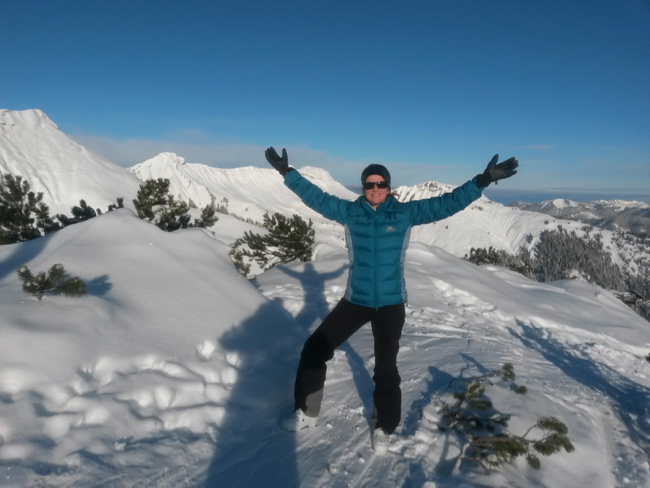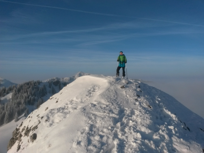 zugigen Gipfel, in Windstille und Sonne ist. Gut ausgeruht geht es dann an die Abfahrt