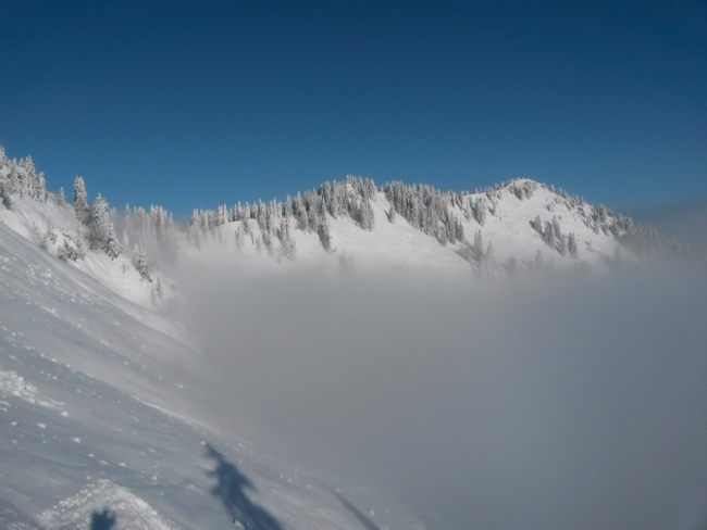 des Gipfelgrates schon wieder im Blindflugmodus Richtung Firstalm im Skigebiet