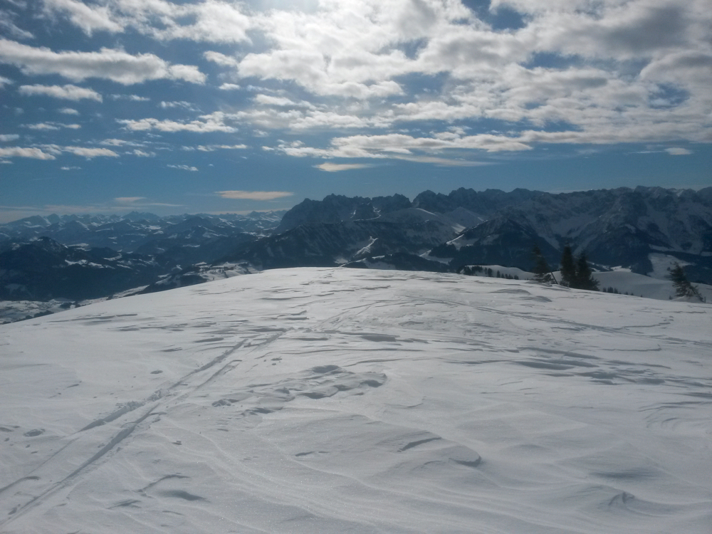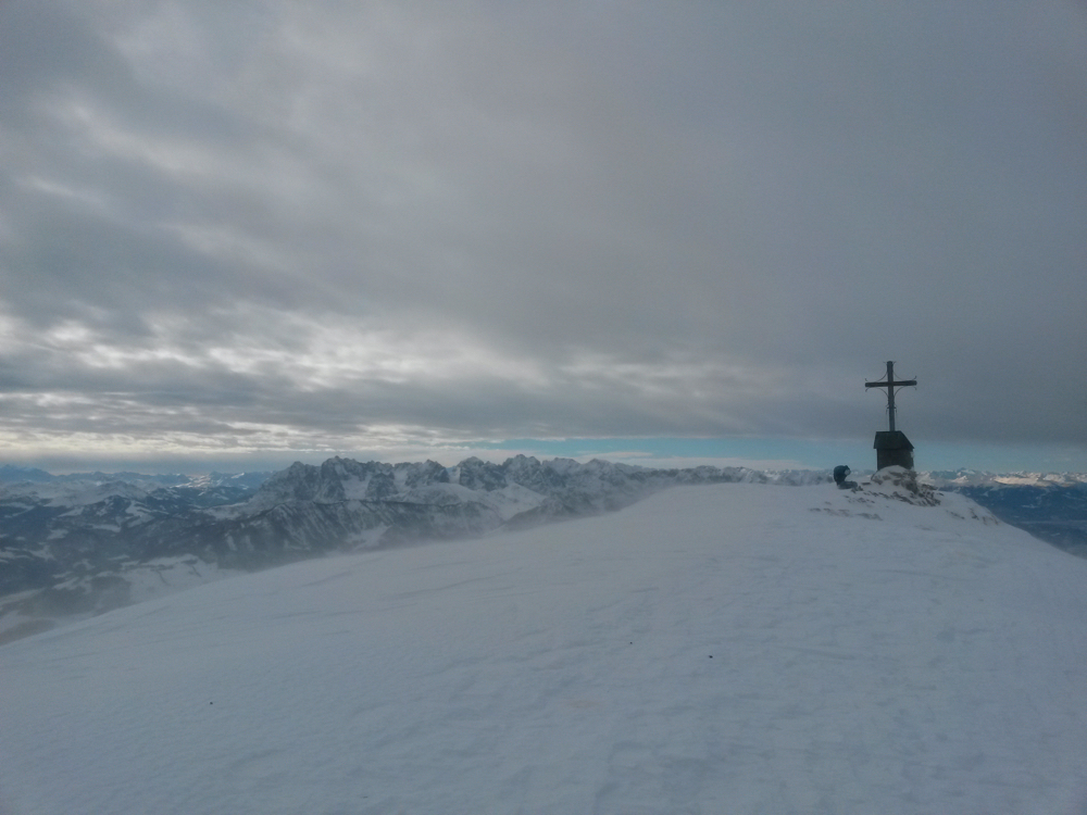 Am Gipfelplateau angekommen präsentiert sich uns der Wilde Kaiser mit seinen schroffen Spitzen.